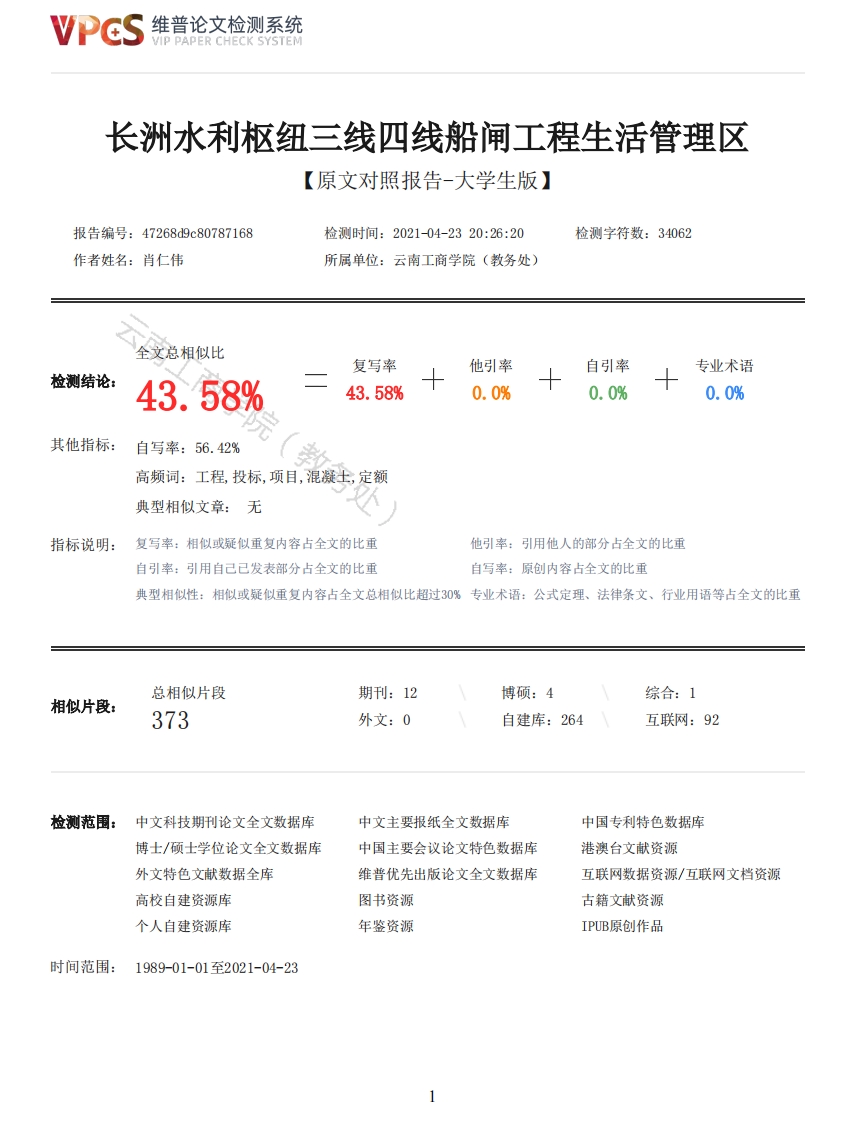 维普论文检测系统/IP PAPER CHECK SYSTEM长洲水利枢纽三线四线船闸工程生活管理区【原文对照报告-大学生版】报告编号:47268d9c80787168检测时间:2021-04-2320:26:20检测字符数:34062作者姓名:肖仁伟所属单位:云南工商学院(教务处)全文总相似比复写率他引率自引率专业术语检测结论:43.58%43.58%0.0%0.0%0.0%其他指标:自写率:56.42%高频词:工程,投标,项目,混凝士,定额典型相似文章:无A指标说明:复写率:相似或疑似重复内容占全文的比重他引率:引用他人的部分占全文的比重自引率:引用自己已发表部分占全文的比重自写率:原创内容占全文的比重典型相似性:相似或疑似重复内容占全文总相似比超过30%专业术语:公式定理、法律条文、行业用语等占全文的比重总相似片段期刊:12博硕:4综合:1相似片段:373外文:0自建库:264互联网:92检测范围:中文科技期刊论文全文数据库中文主要报纸全文数据库中国专利特色数据库博士/硕士学位论文全文数据库中国主要会议论文特色数据库港澳台文献资源外文特色文献数据全库维普优先出版论文全文数据库互联网数据资源/互联网文档资源高校自建资源库图书资源古籍文献资源个人自建资源库年鉴资源IPUB原创作品时间范围:1989-01-01至2021-04-23VPGS维普论文检测系统VIP PAPER CHECK SYSTEM原文对照颜色标注说明:■自写片段■复写片段(相似或疑似重复)口引用片段(引用)■专业术语(公式定理、法律条文、行业用语等)YUNNAN TECHNOLOGY AND BUSINESS UNIVERSITY毕业设计长洲水利枢纽三线四线船闸工程生活管理区0ld people's apartment building of Hantang Center nursing home学院建筑工程学院专业工程造价班级2018级工程造价3班学号18631000128姓名肖仁伟指导教师周成才职称副高成绩日期2020年11月一一2021年04月云南工商学院2021年04月云南工商学院毕业设计诚信声明本人声明,所呈交的论文(设计)是本人在导师的指导下独立完成的研究成果。除了文中特别加以标注引用的内容外,本论文(设计)不包含法律意义上已属于他人的任何形式的研究成果,也不包含本人已用于其他学位申请的论文或成果。对本文的研究做出重要贡献的个人和集体,均已在文中以明确方式表明。本人完全意识到本声明的法律后果由本人承担。本毕业论文(设计)成果归云南工商学院所有。作者签名:日期:云南工商学院毕业设计选题申报表题目名称长洲水利枢纽三线四线船闸工程生活管理区学生姓名肖仁伟学号18631000128联系电话150870574122VPCS维普论文检测系统VIP PAPER CHECK SYSTEM班级2018级工程造价3班分院名称建筑工程学院名称题目口教师科研社会实践题目类型口理论研究应用研究来源口实验(实训)口其它口设计开发口其它目的:投标文件编制为了能够加大中标的几率,是中标能否的关键。编制投标文件是投标过程中一项重要的选题工作,时间紧工作量大要求高,它是能否中标的关键,必须加强领导。目的价值及意义:招标文件是指招标人向投标人提供的为经行投标工作而告知和要求性的书面材料。招标文件是招标投标活动中最重要的法律文件,它不仅规定了完整的招标程序,而且还提出了各项具体的技术标准价和交易条件,规定了拟订立的合同的主要内容,是投标人准备投标文件和参加投标的依据,评审委员会评标值及的依据,也是拟订合同的基础。那么,招标文件是整个是招标活动中的关键性文件。在整个招标活动中起着意义至关重要的作用。招标单位编制招标文件本着公平、公正的原则。使招标文件严密、周到、细致、易解、规范。指导评审意见评审年月日意见分院评审意见:评审毕业论文(设计)指导小组或分院院长(系主任)签名:意见年月日云南工商学院毕业设计任务书题目长洲水利枢纽三线四线船闸工程生活管理区名称学生姓名肖仁伟学号8631000128联系电话15087057412班级2018级工程造价3班分院名称建筑工程学院名称题目口教师科研社会实践口理论研究应用研究题目类型来源口实验(实训)口其它口设计开发口其它1、选题背景1学生参加专业实习或毕业实习的工程项目:2所选工程建筑面积不小于1000m2。三。编制依据(1)《中华人民共和国建筑法》、《中华人民共和国合同法》、《中华人民共和国招标投标法》、《中华人民共和国标准施工招标文件》、《中华人民共和国招标投标法实施条例》:(2)《建筑工程量清单计价规范》(GB50500-2013)、《房屋建筑及装饰装修工程量计算规范》(GB5854-2013)及其说明和勘误:(3)国家、省、行业建设主管部门下达的企业定额、计价定额和计价办法:选题(4)招标文件、招标工程量清单、补充通知、答疑纪要:背景(5)建筑工程设计文件及有关资料:及目(6)的投标时提出的施工场地条件、工程特点和施工组织设计或施工方案:(7)与建设工程有关的标准、规范和技术资料:(8)项目成本管理机构发布的市场价格信息或工程造价信息:(9)其他相关信息。3
