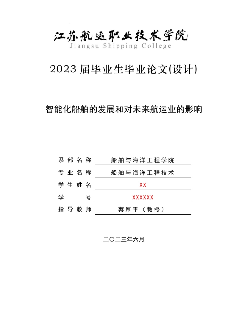 Jiangsu shipping college2023届毕业生毕业论文(设计)智能化船舶的发展和对未来航运业的影响系部名称船舶与海洋工程学院专业名称船舶与海洋工程技术学生姓名XX学号XXXXXX指导教师蔡厚平(教授)二0二三年六月毕业设计(论文)承诺书本人郑重承诺:1、本设计(论文)是在指导教师的悉心指导下,查阅相关文献资料,进行分析研究,独立撰写而成的。2、本设计(论文)中,所有数据和有关材料均是真实的。3、本设计(论文)中除引文和致谢的内容外,不包含其他人或机构已经撰写发表过的研究成果。4、本设计(论文)如有剽窃他人研究成果的情况,一切后果自负。作者签名:签字日期:年月日智能化船舶的发展和对未来航运业的影响摘要:在全球贸易中,海运承担着主导地位,很多大宗商品例如石油、天然气、钢铁、煤炭,相当一部分都需要通过海运来完成运揄。从2020年初到今天,新冠疫情席卷全球,不仅冲击了全球的经济,也给我们的正常生活带来困境。海运凭借其运输量大、运输成本低的特,点,对全球经济的复苏起到非常关键的作用。造船业与海运业密切相关,不可分割,造船业的兴衰也影响希海运业的发展。受疫情影响,海运的运营成本不断提高,如何造出经济性更好、更加安全稳定的船舶成为全球造船业共同探讨的话题。智能化船舶成为未来海运发展大趋势,智能化船舶的研究也逐渐被各国提上日程。本文收录了一些关于智能化船舶的发展状况的阐述以及智能化船舶对未来航运影响的分析,希望对相关工作者在以后的研究中能够提供帮助。关键词:船舶:智能化:海运2