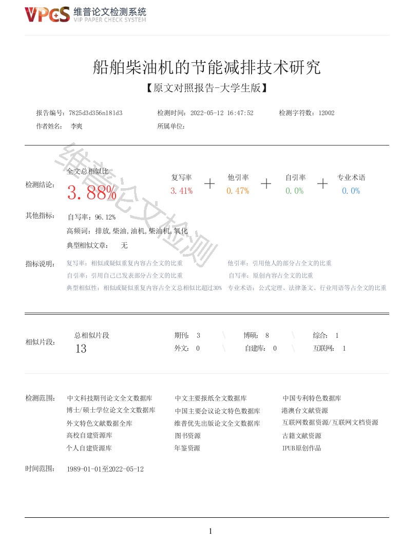 维普论文检测系统VIP PAPER CHECK SYSTEM船舶柴油机的节能减排技术研究【原文对照报告-大学生版】报告编号:7825d3d356nl81d3检测时间:2022-05-1216:47:52检测字符数:12002作者姓名:李爽所属单位:全文总相似比复写率他引率自引率专业术语检测结论:3.88%3.41%0.47%0.0%0.0%其他指标:自写率:96.12%高频词:排放,柴油,油机,柴油机,氧化典型相似文章:无指标说明:复写率:相似或疑似重复内容占全文的比重他引率:引用他人的部分占全文的比重自引率:引用自己已发表部分占全文的比重自写率:原创内容占全文的比重典型相似性:相似或疑似重复内容占全文总相似比超过3%专业术语:公式定理、法律条文、行业用语等占全文的比重总相似片段综合:1相似片段:13外文:0自建库:0互联网:1检测范围:中文科技期刊论文全文数据库中文主要报纸全文数据库中因专利特色数据库博士/硕士学位论文全文数据库中因主要会议论文特色数据库港澳台文献资源外文特色文献数据全库维普优先出版论文全文数据库互联网数据资源/互联网文档资源高校自建资源库图书资源古籍文献资源个人自建资源库年鉴资源IPUB原创作品时间范围:198901-01至2022-05-121VPCS维普论文检测系统VIP PAPER CHECK SYSTEM原文对照颜色标注说明:■自写片段■复写片段(相似或疑似重复)口引用片段(引用)■专业术语(公式定理、法律条文、行业用语等)船舶柴油机的节能减排技术研究摘要近些年,环境保护受到了人们的高度重视,关于环境的诸多问题也得到了解决,人们也越发注意到应该对船舶柴油机的污染进行治理,船用柴油机的废气排放对空气产生了非常大的影响,国际社会对此等问题非常重视,怎样对环境进行治理是我们需要重视的问题。目前,一些法律法规己经被颁布,一个缔约国大会在1997年举行,其来源于海事组织。此会议最终确定下来了防止大气污染的诸多条例,并且将此规则实施在2005年。在ARPL078/78附加条款生效的背景下,分析了对船用柴油的未来影响,并日益严格了排放限值。通过查找船用柴油机排气中NOx的来源,从柴油机燃料、设计和工况三个方面得出了对船用柴油NOx排放的影响。控制废气排放最重要的一点就是将船舶进行仔细而全面的检查。本研究对实船的检测特点以及具有的优点进行分析,指出船用柴油机尾气实船排放的测试方法。然后再对C①2、NOX和S02分别进行了排放比较分析得出结论,通过一些操作或方法可以进行减少污染物的排放。关键词:MARPOL73/78附则VI:排放控制:NOx:机内处理:船舶柴油机Emission Control of Marine Diesel EngineAbstractWith the gradual deterioration of the global environment and the increasing awareness ofpeople's environmental protection,the demand for controlling harmful emissions from marine dieselengines has also been increasing.Air pollution has occurred in the exhaust emissions of marinediesel engines.It has aroused widespread concern in the international community.What we are facingnow is how to protect the environment on which we live has become the most important issue now.Inorder to control the air pollution caused by the exhaust gas emitted by ships,the IMO strengthenedrelevant laws and regulations,and will finally be held at the London headquarters from September 15to 26,1997.In 1997,MARPLO Agreement 73/78,which added Annex VI of MARPLO 73/78 to the preventionof air pollution.The request was implemented on May 19,2005.In the context of the entry into force of the MARPL078/78 additional clauses,the future impacton marine diesel has been analyzed,and emission limits have been tightened day by day.By searchingfor the source of NOx in marine diesel engine exhaust,the impact on marine diesel NOx emissions isobtained from the three aspects of diesel engine fuel,design and operating conditions.Through theanalysis of the main points and advantages of the actual ship inspection,it is concluded that theactual inspection of the ship is an inevitable trend to control the exhaust emissions of marinediesel engines.The test method for the exhaust emissions of the G6300ZC16BB marine diesel engine isfurther listed.Then the C02,NOX,and S02 emissions were compared and analyzed respectively,and itwas concluded that some operations or methods can be used to reduce the emissions of pollutants.Keywords MARPOL 73/78 Annex VI:emission control:NOx,internal processing,marine diesel engine引言2维普论文检测系统VIP PAPER CHECK SYSTEM自1960年代以来,柴油机尾气的排放己严重影响海上生态环境。0以及各地区的相关部门对此现象非常的关心也采取了相应的举措。从而达到将废气排放予以控制的目的。船用柴油机具有诸多特点,比如其具有较大的运输量,运输的成本较低,安全性较高。近些年来,船只的种类与数量不断的增多,从而造成了船用柴油机对环境的不利影响。其拥有强劲的动力,但是排放的污染物也非常巨大。此外,船用柴油机通常使用重油污染物含量非常高,在相同条件下会产生更多的污染物。因此,有必要充分减少船用柴油机有害排放,并加强立法以保护环境。如今人类面临的重要问题是保护我们生活的地球环境。因此考虑人类的长期生存保护环境是非常有必要的。1绪论1.1本研究的背景,意义和目的1.1.1本研究的背景自1960年代以来,减少汽车尾气的排放在一些发达国家进行了制定标准和法规。船用柴油机的动力非常强劲,它们排放的污染物也非常之多。此外船用柴油机通常使用重油,在同一因素下会产生更多的污染物。所以我们有必要减少船用柴油机对环境的污染。制定一系列对环境保护的国际法律法规。