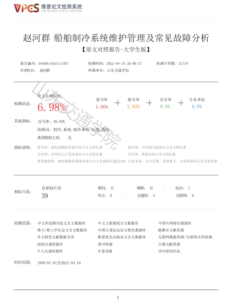 维普论文检测系统VIP PAPER CHECK SYSTEM赵河群船舶制冷系统维护管理及常见故障分析【原文对照报告-大学生版】报告编号:04698c5db7fe1307检测时间:2022-04-1020:00:57检测字符数:21719作者姓名:赵河群所属单位:山东交通学院全文总相似比复写率他引率自引率专业术语检测结论:6.98%4.06%2.92%0.0%0.0%其他指标:自写率:93.02%高频词:制冷,系统,制冷系统,压缩,船舶典型相似文章:无指标说明:复写率:相似或疑似重复内容占全文的比重他引率:引用他人的部分占全文的比重自引率:引用自己已发表部分占全文的比重自写率:原创内容占全文的比重典型相似性:相似或疑似重复内容占全文总相似比超过3%专业术语:公式定理、法律条文、行业用语等占全文的比重总相似片段综合:1相似片段:39外文:0自建库:4互联网:8检测范围:中文科技期刊论文全文数据库中文主要报纸全文数据库中因专利特色数据库博士/硕士学位论文全文数据库中因主要会议论文特色数据库港澳台文献资源外文特色文献数据全库维普优先出版论文全文数据库互联网数据资源/互联网文档资源高校自建资源库图书资源古籍文献资源个人自建资源库年鉴资源IPUB原创作品时间范围:198901-01至2022-04-101维普论文检测系统VIP PAPER CHECK SYSTEM原文对照颜色标注说明:■自写片段■复写片段(相似或疑似重复)口引用片段(引用)■专业术语(公式定理、法律条文、行业用语等)本科毕业设计(论文)题目:船舶制冷系统维护保养及常见故障分析姓名赵河群学号202506108学院航运学院班级轮贯201指导教师于洋2022年4月10日山东交通学院毕业设计(论文)诚信声明本人郑重声明:所呈交的本科毕业设计(论文)是本人在指导老师的指导下,进行研究工作所取得的成果,成果不存在知识产权争议。除文中己经注明引用的内容外,本论文不含任何其他个人或集体已经发表或撰写过的作品成果。对本文的研究做出重要贡献的个人和集体在文中均作了明确的说明并表示了谢意。本人完全意识到本声明的法律结果由本人承担。维普论文检测系统VIP PAPER CHECK SYSTEM毕业设计(论文)作者签名:年月日摘要船舶制冷系统是船舶辅机的重要组成部分。伴随着当代航运业的迅速发展,船舶制冷系统在伙食冷库,空气调节,冷藏运输等方面得到广泛应用。船舶制冷系统一旦发生故障,将直接影响船员的工作效率和冷藏产品的质量。因此,及时对船舶制冷系统进行恰当的维护管理及故障分析,在降低成本和提高冷藏船舶的营运能力方面有着重要的意义。船舶制冷系统是一个由各种设备组成的复杂热力系统,各设备之间密切相关。当其中某一台设备出现故障时,其他装置的运行参数也会随之改变,从而影响整个系统的运行,牵一发而动全身。若船舶制冷系统运转工况出现问题,船舶管理人员应可以根据故障的现象,判断出故障的类型,找出故障的原因,最后迅速地处理掉故障。本文主要对蒸汽压缩式制冷系统进行分析,先介绍船舶制冷系统的基本原理和组成部件,然后主要从对船舶制冷系统的维护管理和常见故障分析两方面进行研究,提出合理的防范措施和处理方法。关键词:制冷系统,维护管理,故障分析,船舶AbstractShip refrigeration systems are an important part of the ship's auxiliary machinery.With therapid development of the contemporary shipping industry,ship refrigeration systems are widely usedin food refrigeration,air conditioning,refrigerated transport and other areas.If a ship'srefrigeration system fails,it will directly affect the efficiency of the crew and the quality ofthe refrigerated products.Therefore,proper maintenance management and fault analysis of shiprefrigeration systems are of great importance in reducing costs and improving the operationalcapacity of refrigerated ships.A ship's refrigeration system is a complex thermal system consisting of various devices,whichare closely related to each other.When one of the devices fails,the operating parameters of theother devices will also change,thus affecting the operation of the whole system and affecting thewhole body.If there is a problem with the operating conditions of the ship's refrigeration system,the ship's management should be able to determine the type of fault,find out the cause of the faultand finally deal with the fault quickly according to the phenomenon of the fault.In this paper,we firstly introduce the basic principles and components of ship refrigerationsystems,and then focus on the maintenance and management of ship refrigeration systems and theanalysis of common faults,and propose reasonable preventive measures and treatment methods.Key words:Refrigeration systems,Maintenance management,Fault analysis,Ships目录前言1绪论1.1课题的背景1.2研究目的及意义···1.2.1研究目的····1.2.2研究意义····1.3国内外研究现状1.4文献综述1.5研究内容及研究方法··