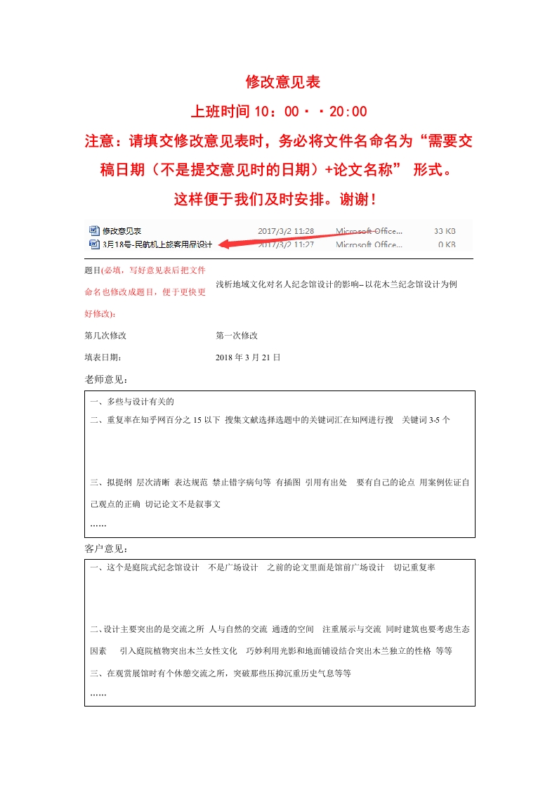修改意见表上班时间10:00··20:00注意:请填交修改意见表时,务必将文件名命名为“需要交稿日期(不是提交意见时的日期)+论文名称”形式。这样便于我们及时安排。谢谢!则3月18号-民航机上旅客用品设计趣目(必填,写好意见表后把文件浅析地域文化对名人纪念馆设计的影响-以花木兰纪念馆设计为例命名也修改成题目,便于更快更好修改):第几次修改第一次修改填表日期:2018年3月21日老师意见:一、多些与设计有关的二、重复率在知乎网百分之15以下搜集文献选择选趣中的关键词汇在知网进行搜关键词3-5个三、拟提纲层次清晰表达规范禁止错字病句等有插图引用有出处要有自己的论点用案例佐证自己观点的正确切记论文不是叙事文客户意见:一、这个是庭院式纪念馆设计不是广场设计之前的论文里面是馆前广场设计切记重复率二、设计主要突出的是交流之所人与自然的交流通透的空间注重展示与交流同时建筑也要考虑生态因素引入庭院植物突出木兰女性文化巧妙利用光影和地面铺设结合突出木兰独立的性格等等三、在观赏展馆时有个休憩交流之所,突破那些压抑沉重历史气息等等改稿日期要求交稿日期:2018年3月27日中午之前补充意见:按时给稿就行格式还是之前的格式请相互理解修改须知:1.因修改需要根据意见查阅相关资料,修改论文内容一般四天左右,格式小问题可以加快,硕士博士毕业论文内容五天到一周左右,如需要加急修改,请和客服详谈。2笼统的意见,恕不修改。您要说出详细修改的意见哦,否则我们也不清楚您的想法。2.请不要将意见一点一点的提出来,请全部整理好以后,一次性发给我们,单独的意见不予受理。3在与初衷无明显出入、不改变题目、文章整体思路和大框架的前提下,免费修改。换题目、大修改视为重写,不予免费。4.凡在成文后换题、追加、细化写作要求,属买家本身的责任,恕不免费修改,敬请谅解。