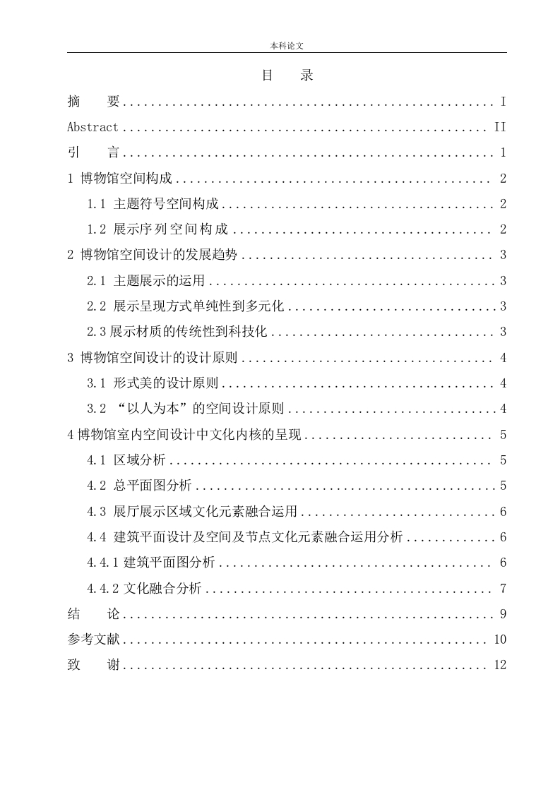 本科论文目录摘Abstract ....II引言121.1主题符号空间构成21.2展示序列空间构成..22博物馆空间设计的发展趋势....332.2展示呈现方式单纯性到多元化..·43.1形式美的设计原则..3.2“以人为本”的空间设计原则..4博物馆室内空间设计中文化内核的呈现.·54.1区域分析...5644建筑平面设计及空间及节点文化元素融合运用分析......664.4.2文化融合分析.7结论9参考文献10致12本科论文摘要随着社会人群生活水平的逐步提高。群众对空间的物质和精神方面有了越来越高的要求,不仅仅是简单的功能要求,精神方面的功能也需要重视,如,民族化、个性化、多样化。所以对于当今社会环境下如何把传统的经典的唯美元素融合到室内空间设计当中,并使元素得到充分的表现,这个研究已经成为了我们当今设计师们使用了中国传统元素,表现出了不一样的室内空间,但却得到了观众的称赞。通过消除表面浮华的现象,我们发现许多东西都只停留在表面上。中国传统文化元素是中国传统文化的重要组成部分,它产生和传播有着足够的生命力。因此,现代设计室内装饰与传统文化有着不可磨灭的关联。以陕西省历史博物馆的建筑设计为例,它包括唐朝时期的建筑设计,以及中国传统的对称设计,将为您展示最新的技术和材料,为您提供最新的功能和服务,为您提供最优雅和最舒适的环境,为您提供最舒适的环境和服务。形成了陕西省最具代表的文化。梳理当代的空间设计的理论研究入手,提出博物馆室内空间的概念,设计原则,特征。通过相关书籍、资料的分析整理,分析博物馆室内空间设计的文化融合呈现。通过对陕西省历史博物馆案例的分析比较,提出文化融合的重要性以及设计方法。因此,引入进现代室内装饰设计。毫无疑问是对中国文化的一种继承手法。对于当今社会如何把经典的元素融入到现代室内空间设计当中,使元素得到表现,研究成为了我们设计师以及研究人员不断思索的问题。关键词:文化融合;室内空间;设计;陕西本科论文AbstractWith the gradual improvement of living standards of social groups.Themasses have higher and higher requirements for the material and spiritualaspects of space,not only for simple functional requirements,but also forspiritual functions,such as nationalization,personalization and diversification.Therefore,in today's social environment,how to integrate the traditional classicaesthetic elements into the interior space design,and make the elements fullyexpressed,this research has become our designers use the traditional Chineseelements,showing different interior space,but it has been praised by theaudience.By eliminating the surface glitz,we find that many things only stay onthe surface.Chinese traditional culture element is an important part of Chinesetraditional culture.It has enough vitality to produce and spread.Therefore,thereis an indelible relationship between modern interior design and traditionalculture.Taking the architectural design of Shaanxi History Museum as an example,it includes the architectural design of Tang Dynasty and the traditionalsymmetrical design of China.It will show you the latest technology andmaterials,provide you with the latest functions and services,provide you withthe most elegant and comfortable environment,and provide you with the mostcomfortable environment and services.It has formed the most representativeculture of Shaanxi Province.Combing the theoretical research of contemporaryspace design,this paper puts forward the concept,design principles andcharacteristics of museum interior space.Through the analysis and arrangement