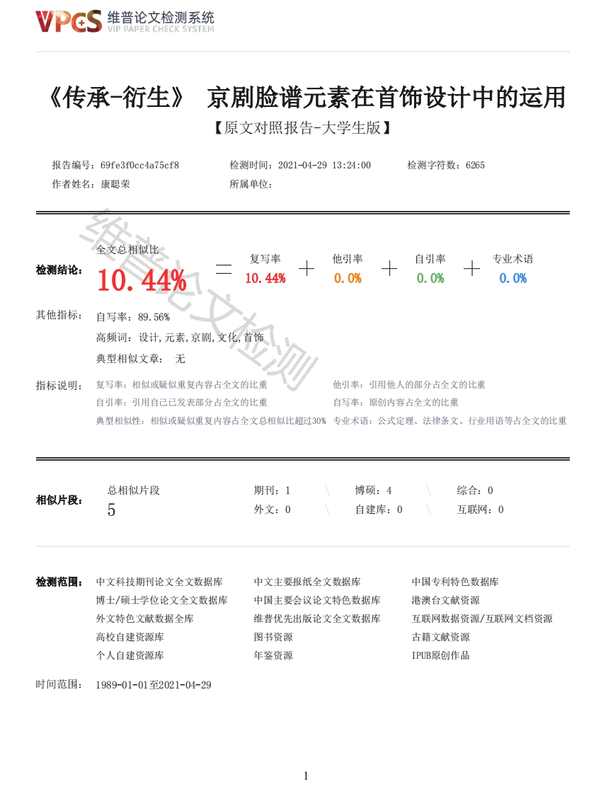 维普论文检测系统VIP PAPER CHECK SYSTEM《传承-衍生》京剧脸谱元素在首饰设计中的运用【原文对照报告-大学生版】报告编号:69fe3f0cc4a75cf8检测时间:2021-04-2913:24:00检测字符数:6265作者姓名:康聪荣所属单位:全文总相似比复写率他引率自引率专业术语检测结论:10.44%10.44%0.0%0.0%0.0%其他指标:自写率:89.56%高频词:设计,元素,京剧,文化,首饰典型相似文章:无指标说明:复写率:相似或疑似重复内容占全文的比重他引率:引用他人的部分占全文的比重自引率:引用自己已发表部分占全文的比重自写率:原创内容占全文的比重典型相似性:相似或疑似重复内容占全文总相似比超过30%专业术语:公式定理、法律条文、行业用语等占全文的比重总相似片段期刊:1博硕:4综合:0相似片段:5外文:0自建库:0互联网:0检测范围:中文科技期刊论文全文数据库中文主要报纸全文数据库中国专利特色数据库博士/硕士学位论文全文数据库中国主要会议论文特色数据库港澳台文献资源外文特色文献数据全库维普优先出版论文全文数据库互联网数据资源/互联网文档资源高校自建资源库图书资源古籍文献资源个人自建资源库年鉴资源IPUB原创作品时间范围:1989-01-01至2021-04-29维普论文检测系统VIP PAPER CHECK SYSTEM原文对照颜色标注说明:■自写片段■复写片段(相似或疑似重复)引用片段(引用)■专业术语(公式定理、法律条文、行业用语等)分类号学校代码11311密级学号20171365211三明学院艺术与设计学院本科生毕业设计(创作)说明书《传承-衍生》题目:京剧脸谱元素在首饰设计中的运用年级:2017级专业:产品设计学生姓名:康聪荣学号20171365211指导教师:原佳丽职称:讲师/硕士指导教师:工作单位三明学院艺术与设计学院完成时间:2021年5月2021年1月制三明学院艺术与设计学院毕业设计/创作说明诚信声明书郑重声明:兹提交的《传承-衍生》(京剧脸谱元素在首饰设计中的运用)毕业设计/创作说明,是本人在指导老师的指导下独立研究、撰写的成果:设计/创作说明未剽窃、抄袭他人的学术观点、思想和成果,未篡改研究数据,设计/创作说明中所引用的文字、研究成果均已在设计/创作说明中以明确的方式标明:在毕业设计/创作说明工作过程中,本人格守学术规范,遵守学校有关规定,依法享有和承担由此设计/创作说明产生的权利和责任。声明人(签名):目录摘要31.设计效果图42.设计说明52.1选题背景与意义52.2课题研究52.3设计原则52维普论文检测系统VIP PAPER CHECK SYSTEM2.4设计灵感来源62.5设计主题62.6造型说明72.7色彩选择82.8材料说明83.构思过程83.1构思草图及说明84.主要创意设计制成品(成型)设计说明104.1设计作品概述105.总结116.作品展示(成品)12参考文献13英文摘要14致谢15《传承-衍生》(京剧脸谱元素在首饰设计中的运用)康聪荣三明学院17级产品设计专业福建三明365004摘要:随着文化创意产业的不断发展,中国传统文化元素也在的珠宝设计作品中逐渐被运用。本文以京剧这一传统文化作为创作点,挖掘和提取其中的经典造型元素及文化内涵,京刷戏曲元素的物态特征如二维平面化的造型,精美的空心装饰,鲜艳的色彩和平面轴活动结构等京剧元素的物理特性为珠宝设计提供了很多灵感;京剧元素独特的光影关系以及声音,光,运动和阴影的叙事表达为珠宝设计提供了更广泛的想法和更多样化的视角。通过设计实现传统与现代的结合,使传统文化元素能够适应当前的文化发展形势,满足人们个性化的需求。1.设计效果设计说明3