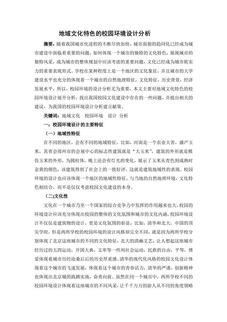 地域文化特色的校园环境设计分析摘要:随着我国城市化进程的不断尽快加快,城市面貌的趋同化已经成为城市建设中面临着重要的问题,如何体现一个城市的独特的文化特色,展现城市的独特风采,成为城市的整体规划中应该考虑的重要问题,文化已经成为城市软实力的重要表现形式。学校在某种程度上是一个地区的文化象征,并且城市的大学建设水平也充分的体现着一个城市的自然地理特征,文化特征,历史背景,经济发展水平,所以,校园环境的设计分析尤为重要,本文主要对地域文化特色的校园环境设计展开分析,找出我国校园文化建设中存在的一些问题,并提出相关的建议,为我国的校园环境设计分析建言献策。关键词:地域文化校园环境设计分析一:校园环境设计的主要特征(一)地域性特征在不同的地区,会有不同的地域特征,比如,河南是一个农业大省,盛产玉米,其省会郑州市的会展中心的标志性建筑就是“大玉米”,建筑的外形就是模仿玉米的外形,为圆柱体,晚上还会有灯光的变化,展示了玉米从青色到成熟时金黄的颜色,该建筑得到了社会上的一致好评,这就是建筑地域性的表现。校园环境的设计也应该体现一个地区的地域性特征,与当地的自然地理环境,文化特色相结合,而不是仅仅考虑校园文化建设的本身。(二)文化性文化在一个城市乃至一个国家的综合竞争力中发挥的作用越来也大,校园的环境设计应该充分体现出校园的整体的文化氛围和城市的文化内涵,校园环境设计不仅仅是建筑物的设计,更是文化氛围的彰显,比如,清华和北大,中国的顶尖学府,但是两所学校的校园环境的设计风格却完全不同,就是因为两所学校分别体现了北京这座城市的不同的文化特征,北大的清幽文艺,让人想起这座城市经历过的五四运动,开国大典,文革等一些列社会运动,民族的自由,平等,博爱体现着城市历经沧桑后后的历史厚重感。清华的现代化风格的校园文化设计体现着这个城市的飞速发展,体现着这个城市的青春活力,清华的严谨,创新精神也体现出北京城的践踏实地,奋勇向前。虽然在同一个城市中,两所学校不同的校园环境设计体现着这座城市的不同风采,让千千万万的游人从不同的角度领略这个城市的文化魅力。(三)时代性随着我国教育体制的不断完普,教育水平的不断提高,能够接受教育的人越来越多,尤其是近年来,大学扩招,很多学校建设了新校区,新校区如何建设成为一个重要的问题。新校区的建设当然也应该注意到前面提到过的地域性,文化性特征,但还应该考虑到的就是时代性。时代在飞速发展,大学作为接受社会前沿知识的场所,应该充分体现这个时代和社会的发展,并且校园作为传播知识的场所,尤其是大学,更应该承担起不断创新,推动科技进步,推动这个社会发展的重任,这是大学的社会责任,所以大学的新校区在建设的过程中,尤其是以理工科为主的校区,应该充分体现时代的进步,与时俱进,不断创新。二:我国校园文化环境的发展现状教育的不断发展,教学体系的演变推动着校园环境设计的不断转变,校园不应该仅仅是象牙塔,这体现不出来校园的社会作用。比如,随着产学研一体化观念的提出,很多的高科技产业,公司在大学周围崛起,很多学校也和企业建立了长期的合作关系,企业帮助帮助学校教学,为广大学子带去最前沿的行业知识,学校也帮助企业培养了大量的人才,为企业带去新鲜活力。大学的公共设施的受益群体也不仅仅局限于让学校的老师和学生,城市的市民也会成为校园建设的受益者,总之,我国目前的大学文化环境建设正在朝着城市共享的理念发展,校园的文化环境建设与城市的综合因素相互相互影响,密不可分。三.校园文化建设的主要注意事项(一)自然因素是校园环境建设的前提自然因素是在进行建筑设计时最基础的考虑因素,遇到不能通过人为措施避免的不可抗的自然因素时,再好的校园文化环境设计也不能付诸实践。比如在我国的西南地区,滑坡泥石流自然灾害明显,校园的环境设计应该充分考虑到对这些自然灾害的防范。在地震的多发区,校园的而环境设计应该考虑到避开断裂带,在建筑的选材,建筑结构上都应该注意增强建筑物的抗震能力。当然,对自然因素的考察不应该仅仅局限于对自然灾害的防范上,还应该注意考虑到当地的气候,水文,地质,地貌等多种自然条件,充分利用当地自然环境的优点,巧妙的避开自然环境可能带来的弊端。(二)文化因素是校园环境建设的背景地域文化是一个地区的人们在长期的生活中形成的风俗习惯,生活方式的传承,我们常说一方水土养一方人,一个地区的文化特色彰显着一座城市的独一无二的风采,地域文化是校园文化建设的大背景。我们经常可以看到这样的现象,虽然一些学校的环境建设在整体上看起来很美丽,但是没有任何特色,没有一处景观给别人留下深刻的印象,这就是没有考虑到文化背景导致的结果。花花草草,山山水水等自然景观的确很美丽,但是在很多地方都能见到,不能给人留下深刻的印象,没有独特性,有时候能够打动人心,被人记住,并形成校园特色的往往是那些潜在的文化氛围,那些能彰显这所学校甚至这个城市文化魅力的建筑。比如,在华北水利水电大学,没有一个学生不知道三峡大坝的岩心柱伫立在学校的湖边,虽然并不漂亮,但却诉说着这个学校的治水,爱水情怀,也体现着治水