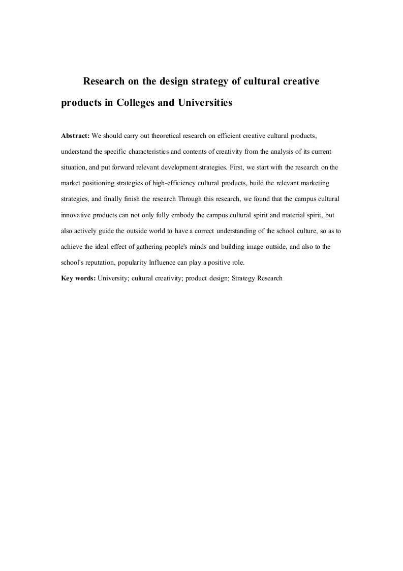 Research on the design strategy of cultural creativeproducts in Colleges and UniversitiesAbstract:We should carry out theoretical research on efficient creative cultural products,understand the specific characteristics and contents of creativity from the analysis of its currentsituation,and put forward relevant development strategies.First,we start with the research on themarket positioning strategies of high-efficiency cultural products,build the relevant marketingstrategies,and finally finish the research Through this research,we found that the campus culturalinnovative products can not only fully embody the campus cultural spirit and material spirit,butalso actively guide the outside world to have a correct understanding of the school culture,so as toachieve the ideal effect of gathering people's minds and building image outside,and also to theschool's reputation,popularity Influence can play a positive role.Key words:University;cultural creativity;product design;Strategy Research目录1.1研究背景和意义.11.1.2研究意义1.2研究方法和内容.21.2.2研究内容。3第2章高校文化创意产品的现状分析…42.1高校文化创意产品的类别…42.2高校文化创意产品的特点....5第3章高校文化创意产品设计策略分析3.1高校文化创意产品的设计原则...63.1.1围绕学校品牌形象..63.1.2符合学生需求.·63.2高校文化创意产品的设计方向…73.2.1主题内容设计.73.2.2风格与外观设计.…73.2.3功能设计..73.3高校文化创意产品的市场定位与营销策略...83.3.1市场定位策略..83.3.2营销策略..9104.1设计要点确定104.4设计效果图.1215致谢第1章绪论1.1研究背景和意义1.1.1研究背景文化是一个国家发展的根本,根据我国政府工作报告可以了解到我国要致力于增强文化自信,坚持社会主义发展,坚持中国文化特色主义道路。高效的建设被我国政府重视起来,可以说是教育建设的主要工程,也是我国大力开展的教学工作基地。由此可见国家十分重视高校的建设,也致力于文化方面的培养。在国家政府的支持下要积极开展校园文化活动,举办相应的文化产品设计大赛等。高校文化产品交流会等也正在兴起,掀起了一股热潮。学校是承载着文化发扬与传承的教育圣地,对学生养成良好的文化素质而言,高效的校园文化在这一该过程中起着决定性的作用,正因如此,建设出优质的校园文化氛围才会显得尤为关键。但就目前我国高校的发展状况而言,建设优质的校园文化成为了绝大多数高校发展的薄弱环节,且在推广与传承校园文化方面也缺乏足够的重视程度。在建设优质校园文化的过程中合理的引入校园文化创业产品,不仅可以为该进程起到良好的促进作用,还可以使高校的综合竞争力得到很大程度的提升。1.1.2研究意义首先,衡量一个校园文化创意产品是否成功,主要是看它能不能将学生们的爱校情结充分的激发出来、能不能使学生和教师对自己学校的认同感和归属感得到显著的加强、能不能缩短教师、学生与学校之间的情感距离、能不能使校内形成一种团结友爱的集体氛围等。其次,若是将校园文化创意产品作为宣传的主要媒介,必然会使更多的人能够了解到学校的基本情况,进而便可带动校园创意经济的持续高速发展。结合以上内容便可总结出最终的结论:校园文化创意产品的出现不仅可以使校园文化得到良好的传承与发展,还可以促进校园经济效益的持续高速发展。此外,校园文化创新产品必须建立在高校校园文化的基础之上进行
