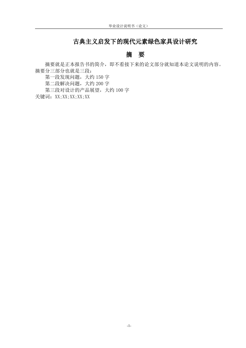 毕业设计说明书(论文)古典主义启发下的现代元素绿色家具设计研究摘要摘要就是正本报告书的简介,即不看接下来的论文部分就知道本论文说明的内容。摘要分三部分也就是三段:第一段发现问题,大约150字第二段解决问题,大约200字第三段对设计的产品展望,大约100字王·:空气净化器设计Abstract把上面的文字翻译过来,严谨百度翻译!Keywords:XX;XX;XX;XX;XX毕业设计说明书(论文)引言(将当前社会或习惯中使用的产品情况作简洁分析,然后自然过渡到你所设计的产品上,阐述和你设计产品上所体现的相关内容和文化内涵)家具作为室内设计中的大件物品,在空间划分和气氛营造上起着举足轻重的作用搞好家具设计,不仅有助于提高室内环境的质量,还能相关带动室内设计的发展中国传统家具的历史可追溯到公元前1600多年的商朝,从商周发展至明清时代的3500年,中国传统家具的发展大致可分为四个阶段:第一阶段,自商周至三国期间,中华民族以席地跪坐的生活方式形成了矮型家具,此阶段已形成了木俎、床、榻、几、案等家具。第二阶段,自两晋、南北朝至隋唐期间,席地而坐的生活方式依然存在,但在多民族文化的融合下,引起了高型家具的产生和发展,并带来由席地而坐到垂足而坐的生活习惯的改变。唐代以前,人们的起居和坐卧方式大体上没有多大变化,到了唐代后期,已出现了桌椅。桌是由几案演变而来,在敦煌第85窟的唐代壁画中,可以见到有屠夫在板桌上切肉的形象,还有许多人围坐在长桌旁进行宴饮的场面。第三阶段,自宋至元朝,垂足而坐的生活习惯得以普及,随之高型家具普遍流行发展。宋时,人们才渐渐采用现今的桌椅,在工艺上具有典雅、平易的艺术风格。家具以质朴的造型取胜,很少有繁缛的装饰,使人感到一种清淡的美。第四阶段,明清时期,中国式家具发展到了鼎盛时期,形成了东方家具特有的艺术风格.随着现代社会的发张和科学技术的颈进步,以及生活方式的改变,家具业永远处于不停顿的发展变化之中,家具不仅表现为一类生活器具、工业产品、市场商品,同时还表现为一类文化艺术作品是一种文化形态与文明的象征。