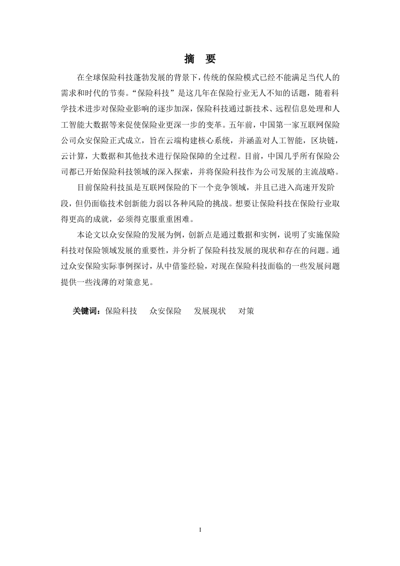 摘要在全球保险科技蓬勃发展的背景下,传统的保险模式已经不能满足当代人的需求和时代的节奏。“保险科技”是这几年在保险行业无人不知的话题,随着科学技术进步对保险业影响的逐步加深,保险科技通过新技术、远程信息处理和人工智能大数据等来促使保险业更深一步的变革。五年前,中国第一家互联网保险公司众安保险正式成立,旨在云端构建核心系统,并涵盖对人工智能,区块链,云计算,大数据和其他技术进行保险保障的全过程。目前,中国几乎所有保险公司都已开始保险科技领域的深入探索,并将保险科技作为公司发展的主流战略。目前保险科技虽是互联网保险的下一个竞争领域,并且已进入高速开发阶段,但仍面临技术创新能力弱以各种风险的挑战。想要让保险科技在保险行业取得更高的成就,必须得克服重重困难。本论文以众安保险的发展为例,创新点是通过数据和实例,说明了实施保险科技对保险领域发展的重要性,并分析了保险科技发展的现状和存在的问题。通过众安保险实际事例探讨,从中借鉴经验,对现在保险科技面临的一些发展问题提供一些浅薄的对策意见。关键词:保险科技众安保险发展现状对策ABSTRACTIn the context of the development of world insurance technology,the traditionalinsurance model can no longer meet the needs of modern people and the rhythm ofthe times."Insurance technology"is the past few years,no one in the insuranceindustry does not know the topic,the impact of scientific and technological progresson the insurance industry will gradually deepen,new technologies in insurancetechnology,through in-vehicle information service systems and artificial intelligenceand other data,the insurance industry.Five years ago,Zhongan Insurance,China 'sfirst internet insurance company,was formally established to build a core system inthe cloud and cover the entire process of insurance protection for artificial intelligence,blockchain,cloud computing,big data,and other technologies.At present,almost allinsurance companies in China have begun in-depth exploration in the field ofinsurance technology,and take insurance technology as the company's mainstreamstrategy for development.At present,although insurance technology is the next competitive field ofInternet insurance and has entered the stage of high-speed development,it still facesthe challenge of various risks due to weak technological innovation capabilities.Inorder for insurance technology to achieve higher achievements in the insuranceindustry,it is necessary to overcome many difficulties.This paper takes the development of Zhongan Insurance as an example,Thepoint of innovation is to illustrate the importance of implementing insurancetechnology to the development of the insurance field through data and examples,analyze the development status and existing problems of insurance technology,andpass the actual examples of Zhongan Insurance.Explore,draw lessons from it,andprovide some shallow countermeasures and suggestions on some development issuesfacing insurance technology now.Key words:Insurance TechnologyZhongAn InsuranceDevelopmentStatusCountermeasures目录一、引言1(一)选题背景及意义····1(一)在国家政策支持下的保险科技2(三)保险科技应用各个层次...44(二)科技赋能新保险.·····(三)众安保险值得借鉴的地方,······6四、保险科技发展过程中存在的问题以及对策.·77五、总结1011致