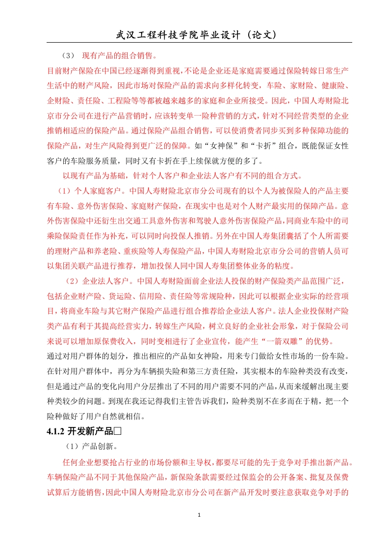 武汉工程科技学院毕业设计(论文)(3)现有产品的组合销售目前财产保险在中国已经逐渐得到重视,不论是企业还是家庭需要通过保险转嫁日常生产生活中的财产风险,因此市场对保险产品的需求向多样化转变,车险、家财险、健康险、企财险、责任险、工程险等等都被越来越多的家庭和企业所接受。因此,中国人寿财险北京市分公司在进行产品营销时,应该转变单一险种营销的方式,针对不同经营类型的企业推销相适应的保险产品。通过保险产品组合销售,可以使消费者同步买到多种保障功能的保险产品,对生产风险得到更广泛的保障。如“女神保”和“卡折”组合,既能保证女性客户的车险服务质量,同时又有卡折在手上续保就方便的多了。以现有产品为基础,针对个人客户和企业法人客户有不同的组合方式。(1)个人家庭客户。中国人寿财险北京市分公司现有的以个人为被保险人的产品主要有车险、意外伤害保险、家庭财产保险,在现实中也是对个人财产最实用的保障产品。意外伤害保险中还衍生出交通工具意外伤害和驾驶人意外伤害保险产品,同商业车险中的司乘险保险责任作为补充,可以同时向投保人推销。另外在中国人寿集团囊括了个人所需要的理财产品和养老险、重疾险等人寿保险产品,中国人寿财险北京市分公司的营销人员可以集团关联产品进行推荐,增加投保人同中国人寿集团整体业务的粘度。(2)企业法人客户。中国人寿财险面前企业法人投保的财产保险类产品范围广泛,包括企业财产险、货运险、信用险、责任险等常规险种,因此可以根据企业实际的经营项目,将商业车险与其它财产保险产品进行组合推荐给企业法人客户。法人企业投保财产险类产品有利于其提高经营实力,转嫁生产风险,树立良好的企业社会形象,对于保险公司来说可以增加原保费收入,同时变相进行了企业宣传,能产生“一箭双雕”的优势。通过对用户群体的划分,推出相应的产品如女神险,用来专门做给女性市场的一份车险。在针对用户群体中,再分为车辆损失险和第三方责任险,其实根本的车险种类没有改变,但是通过产品的变化向用户分层推出了不同的用户需要不同的产品,从而来缓解出现主要种类较少的问题。到现在我还记得我们主管告诉我们,险种类别不在多而在于精,把一个险种做好了用户自然就相信。4.1.2开发新产品□(1)产品创新。任何企业想要抢占行业的市场份额和主导权,都要尽可能的先于竞争对手推出新产品。车辆保险产品不同于其他保险产品,新保险条款需要经过保监会的公开备案、批复及保费试算后方能销售,因此中国人寿财险北京市分公司在新产品开发时要注意获取竞争对手的1武汉工程科技学院毕业设计(论文)信息,及时掌握行业及关联产业动态,在新产品开发时抓住主动权,争取进行差异化产品设计,根据不同车型市场、不同的消费群体开发保险责任更全面的保险产品。(2)推动品牌车险产品建设由于电销中心成立时间较短,公司品牌的市场认同度相比大型财险集团仍有较大差距,但是可以通过实施产品品牌差异化营销模式,在一定程度上弥补公司品牌的不足。目前寿险市场中已经诸如中英人寿有“小太阳”,平安人寿有“世纪天使”,信诚人寿有“未来有数”,太平人寿有“太平阳光”等寿险产品通过产品品牌的差异化来吸引客户。但是在财险市场上尚未见到有特色的品牌产品。电销中心可以根据当地客户的特点,如根据车主性别、驾龄、年龄、安全驾驶状况、车辆用途、职业、区域等影响开车风险的重要指标的分析,有针对性的推出一到两款品牌车险产品。品牌车险走差异化营销的全新思路,它可以有效的区分开目前用保险代理费变相降价打折,以赔促保,简单粗暴切割市场的传统做法。尝试走品牌车险的新营销模式,对做好细分客户,细分渠道,避免单一、恶性的价格竞争都将起到主动积极的推动作用,最终实现打造品牌车险产品服务专业、理赔便捷的核心理念,拉开与一般车险产品的差别,推动公司车险业务的良性发展。4.2中国人寿保险公司车险客户忠诚度低的解决对策4.2.1提高团队员工专业性(1)加强营销团队培训。中国人寿武汉市电销中心的现有展业销售人员不足,员工工作量大导致工作效率低。目前武汉市的销售业务员多数以维护型业务员为主,建议增加市场拓展型业务销售人员比例。对于销售人员的营销素质不断加强,提高销售人员的保费利润转化率的观念,转变原有的只要保费收入,不看业务质量的销售观点。并且加强团队管理人员建设,结合管理人员的业务拓展能力、工作经验、风险管控能力和利润转化率等因素来考核管理人员,减少人才流失,同时精准管理人力成本。(2)引入人才。中国人寿武汉市电销中心的现有产品的利润精算依靠总公司的精算部,对本地区的产品的经营状况精算不足,引入精算人才能够精准计算电销中心分公司的业务风险规模、保费收入利润率。(3)提高客户服务质量。商业车险产品质量体现在员工服务质量上,中国人寿电销中心对于客户投诉或问题反馈要第一时间进行回访和意见整理,用最简便的流程解决客户问题。对一线销售人员和兼业代理出单人员进行定期性培训,对协助提供增值服务的供应商提高考核要求和标准4.2.2完善已有客户服务体系2武汉工程科技学院毕业设计(论文)(1)增强续保管理