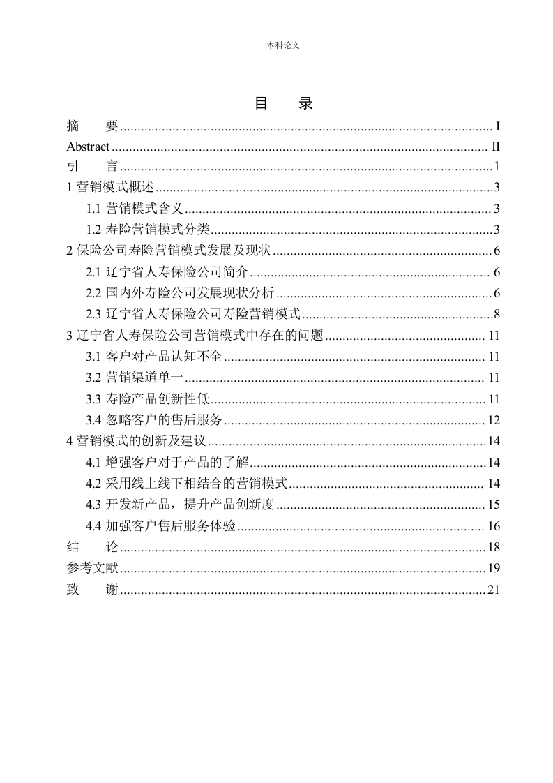 本科论文目录摘Abstract.…引言11营销模式概述31.2寿险营销模式分类32保险公司寿险营销模式发展及现状.62.1辽宁省人寿保险公司简介62.2国内外寿险公司发展现状分析2.3辽宁省人寿保险公司寿险营销模式.…83辽宁省人寿保险公司营销模式中存在的问题113.1客户对产品认知不全113.2营销渠道单一113.3寿险产品创新性低113.4忽略客户的售后服务124营销模式的创新及建议.144.1增强客户对于产品的了解.…4.2采用线上线下相结合的营销模式144.3开发新产品,提升产品创新度154.4加强客户售后服务体验16结18参考文献19致谢21本科论文摘要现如今,中国的寿险行业发展参差不齐,但同时保险行业作为金融行业之一,随着国家的发展不断发展壮大起来,是一种朝阳产业。其中人寿保险有着其独特的发展优势。在著名的马斯洛需求层次理论中,我国已经超越追求生理需求阶段,大部分国民己经开始追求安全层次需要,即人身安全。但是人寿保险在自身发展的同时也存在着一些问题,现阶段人寿保险也在不断完善,在人民的生活中也起到了重要的作用。本篇论文基于对辽宁省人寿保险公司的深入研究。对辽宁省人寿保险公司的营销模式进行研究、分析,了解到目前寿险行业在营销方面不尽如人意。比如营销渠道单一、寿险产品创新性低、不能针对性的向客户进行销售等问题。其本质因素在于营销管理者的决策制定。也与目前寿险行业所处的社会环境、人们的观念意识,从业者的专业能力有关。本文通过对营销模式的深入分析,同时在多方面提出问题并作出相应解答。希望通过本次研究尽可能改变目前寿险的营销现状,使寿险行业更加适用于市场的需求。关键词:保险行业;营销模式;营销渠道本科论文AbstractNowadays,the development of China's life insurance industry is uneven,but at the same time,as one of the financial industries,the insurance industry isa rising industry with the continuous development of the country.Among them,life insurance has its unique development advantages.In the famous Maslow'shierarchy of needs theory,China has surpassed the stage of pursuingphysiological needs,and most citizens have begun to pursue the needs ofsecurity level,that is,personal safety and health.However,life insurance alsohas some problems at the same time of its own development.At this stage,lifeinsurance is constantly improving,and it has also played an important role inpeople's lives.This paper is based on an in-depth study of Liaoning Life InsuranceCompany.Research and analyze the marketing model of Liaoning LifeInsurance Company.Learned that the current life insurance industry is notsatisfactory in terms of marketing.For example,the level of practitioners isuneven,customers have more difficult to understand the types of insurance,themarketing channel is single,the marketing service awareness is weak,and thebusiness ability is not high.The reason is that the essential factor lies in thedecision-making of marketing managers.It is also related to the current socialenvironment in which the life insurance industry is located,people's conceptawareness,and the professional capabilities of practitioners.This article throughin-depth analysis of the marketing model,at the same time raise questions invarious aspects and make corresponding answers.It is hoped that this researchwill change the current marketing status of life insurance as much as possible,sothat the life insurance industry is more suitable for the needs of the market.Key words:insurance industry;Marketing mode;Marketing channels