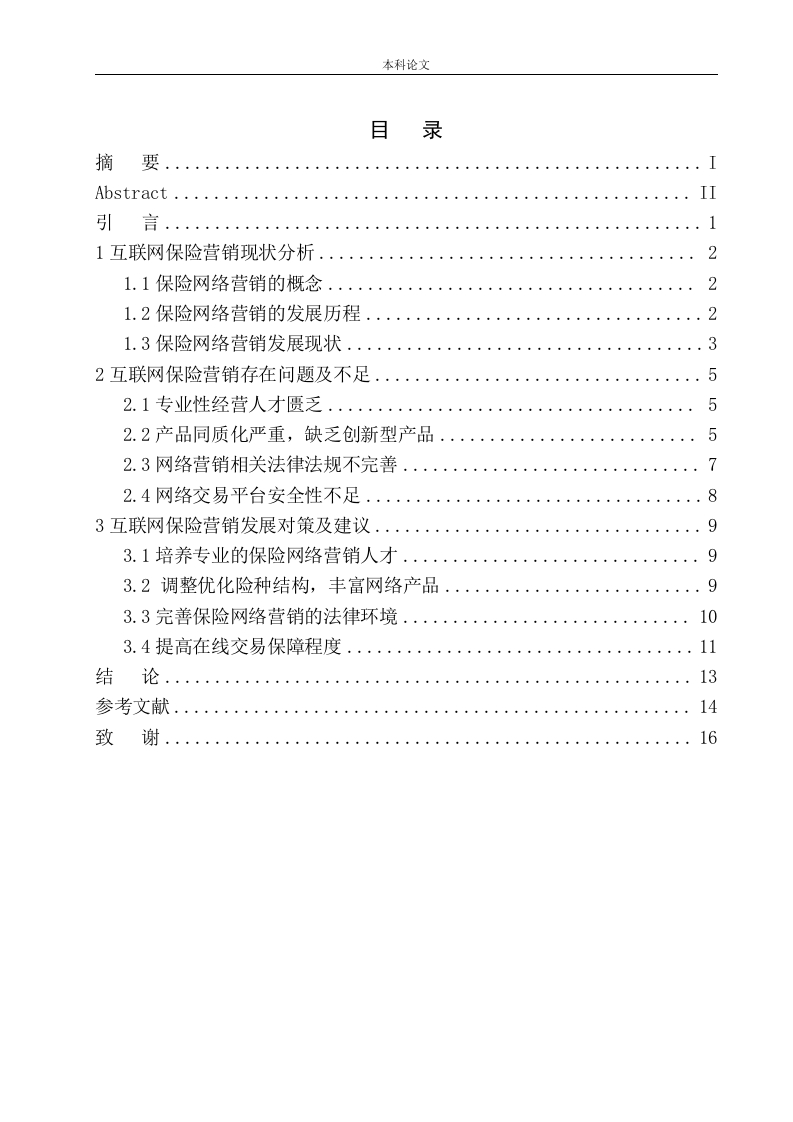 本科论文目录摘Abstract .....II引言…11互联网保险营销现状分析221.2保险网络营销的发展历程..32互联网保险营销存在问题及不足...·52.1专业性经营人才匮乏…52.2产品同质化严重,缺乏创新型产品..52.3网络营销相关法律法规不完善....72.4网络交易平台安全性不足...893.1培养专业的保险网络营销人才..·93.2调整优化险种结构,丰富网络产品93.3完善保险网络营销的法律环境.·103.4提高在线交易保障程度11结13参考文献..14致谢16本科论文摘要我国保险业一直处于大而不强的困境中,虽然我国人口数量比较多、保险行业整体规模较大,但2018年我国人均保费为2724元,只占人均家庭总收入的0.5%,人均持有保单0.13张,远低于发达国家的指标。我国居民的生活水平逐渐提高、保险市场机制不断发展完善是造成这种现象的主要原因,但我国保险普及率和保险意识以及保险业本身发展速度都不尽相同,而保险互联网营销模式的出现则为保险业解决这个难题提供了一个有效的方法。因此,保险互联网营销将成为保险公司在竞争激烈的金融市场中实现长期稳定发展的关键手段之一。然而保险在网络营销过程中也存在很多问题,如:保险互联网营销缺少专业性人才、网络营销环境恶劣、产品同质化严重。这些社会问题严重妨碍了保险行业进行网络市场营销的发展,因此,研讨这个问题具有一定的实用价值。本文通过对平安人寿电销中心网络营销现状进行了调查,指出其在发展过程中存在的主要问题,并结合企业网络营销相关理论,对平安人寿电销中心如何才能更好的经营保险网络营销提出建议和营销策略,为保险业互联网营销的未来发展提供了一定的借鉴和参考。关键词:互联网保险;网络营销;营销策略本科论文AbstractChina's insurance industry has always been in the predicament ofbeing big but not strong.Although China has a large population and theoverall scale of the insurance industry is relatively large,the per capitainsurance premium in 2018 in China was 2,724 yuan,accounting foronly0.5%of the per capita household income,and the per capita holding of0.13 insurance policies was far lower than the indicators of developedcountries.Residents in our country;standard of living increased gradually,theinsurance market mechanism is the main cause of this phenomenon isdeveloping and perfecting constantly,but our country insurance penetrationand consciousness,and the insurance industry itself development speed isdifferent,and the emergence of the Internet marketing model has insurancesolve this difficult problem for the insurance industry provides an effectivemethod.Therefore,insurance Internet marketing will become one of the keymeans for insurance companies to achieve long-term stable development inthe highly competitive financial market.However,there are also manyproblems in the process of insurance network marketing,such as the lack ofprofessional talents in insurance Internet marketing,the bad networkmarketing environment,and the serious homogeneity of products.Thesesocial problems have seriously hindered the development of networkmarketing in the insurance industry.Therefore,it is of certain practical valueto study this problem.In this paper,we study on ping an life insurance company networkmarketing situation of the electric pin,points out its main problems in theprocess of development,and related theory,combined with the enterprisenetwork marketing for peace life electric pin center how to better businessinsurance network marketing and marketing strategies are put forward on,forthe future development of insurance industry Internet marketing provides acertain reference and reference.Keywords:online insurance network marketing:marketing planning