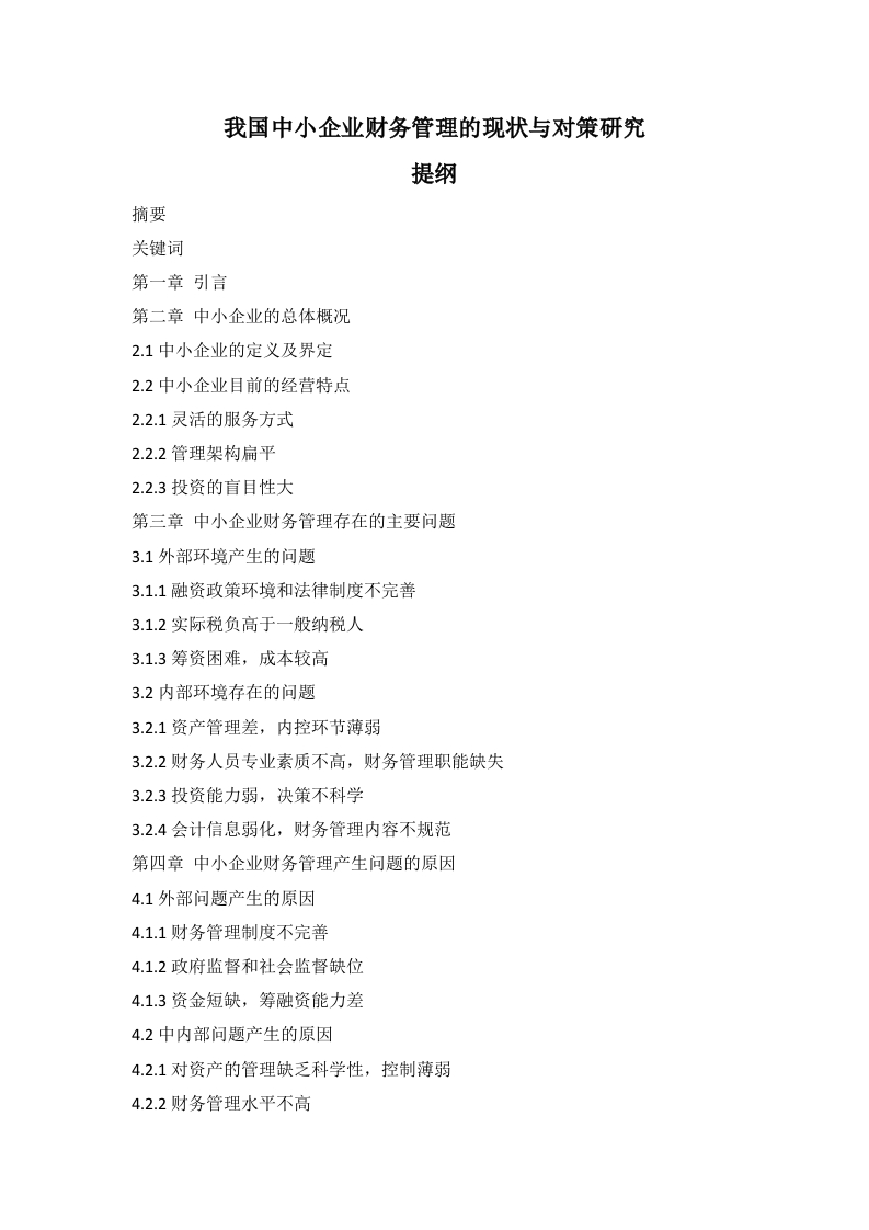 我国中小企业财务管理的现状与对策研究提纲摘要关键词第一章引言第二章中小企业的总体概况2.1中小企业的定义及界定2.2中小企业目前的经营特点2.2.1灵活的服务方式2.2.2管理架构扁平2.2.3投资的盲目性大第三章中小企业财务管理存在的主要问题3.1外部环境产生的问题3.1.1融资政策环境和法律制度不完善3.1.2实际税负高于一般纳税人3.1.3筹资困难,成本较高3.2内部环境存在的问题3.2.1资产管理差,内控环节薄弱3.2.2财务人员专业素质不高,财务管理职能缺失3.2.3投资能力弱,决策不科学3.2.4会计信息弱化,财务管理内容不规范第四章中小企业财务管理产生问题的原因4.1外部问题产生的原因4.1.1财务管理制度不完善4.1.2政府监督和社会监督缺位4.1.3资金短缺,筹融资能力差4.2中内部问题产生的原因4.2.1对资产的管理缺乏科学性,控制薄弱4.2.2财务管理水平不高4.2.3对资金缺乏投资预算决策功能4.2.4财务意识薄弱,财务结构失衡第五章解决中小企业财务管理问题的对策5.1建立良好的外部环境5.1.1财务管理制度不完善5.1.2加大政府的扶持力度5.1.3改普筹资环境,促进企业良好发展5.2加强自身内部的财务管理5.2.1提高营运资产管理水平,加强财务控制环节5.2.2提高财务人员的素质5.2.3提高投资决策水平,积极防范投资风险5.2.4加大会计信息的披露力度第五章结束语参考文献致谢