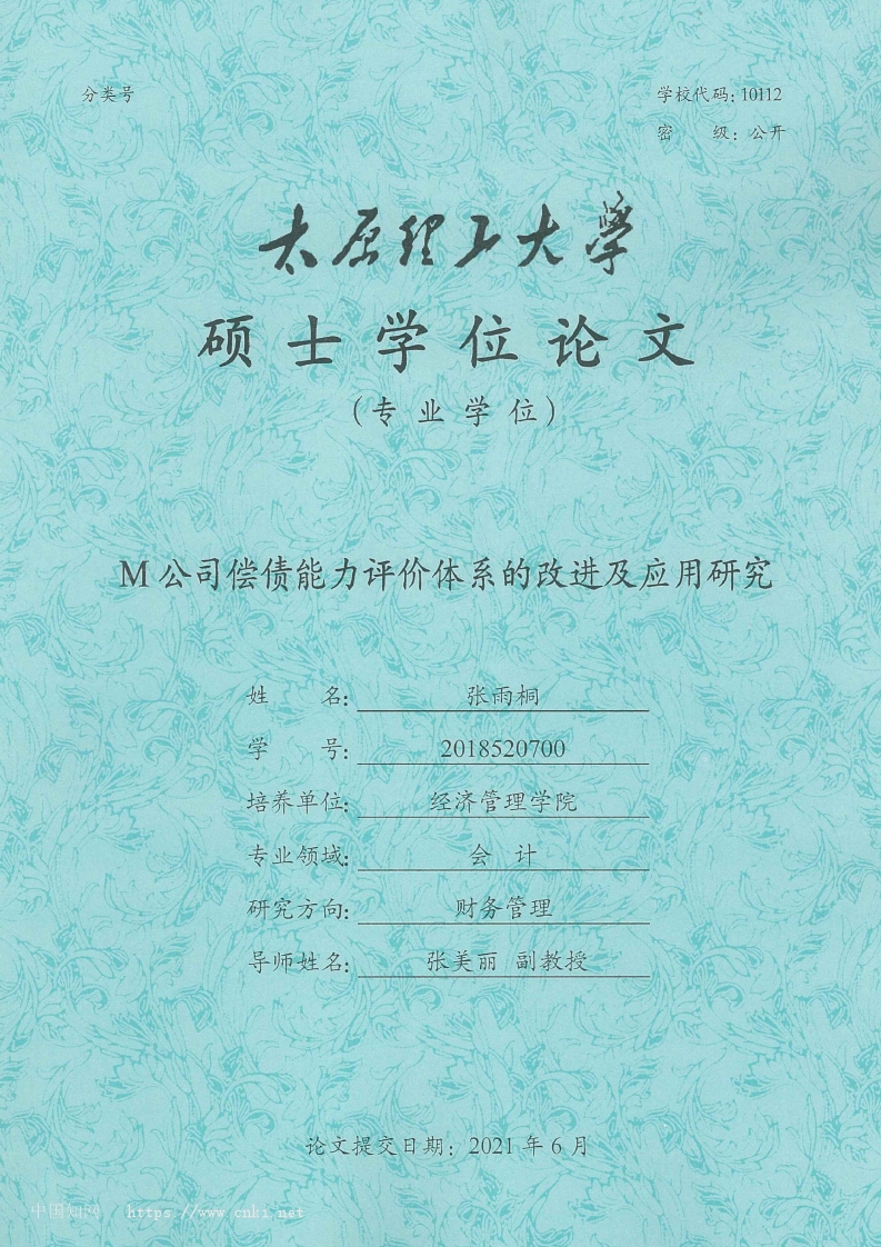 分类号学校代码:10112密级:公开硕士学位论文M公司偿债能力评价体系的改进及应用研究姓名:张雨桐学2018520700培养单位:经济管理学院专业领域会计研究方向:财务管理导师姓名:张美丽副教授论文提交日期:2021年6月https.//www.ne4A Dissertation Submitted toTaiyuan University of TechnologyIn partial fulfillment of the requirementFor the degree of MasterImprovement and Application Research of M Company's SolvencyEvaluation SystemByYutong ZhangCollege of Economics and managementJune 2021