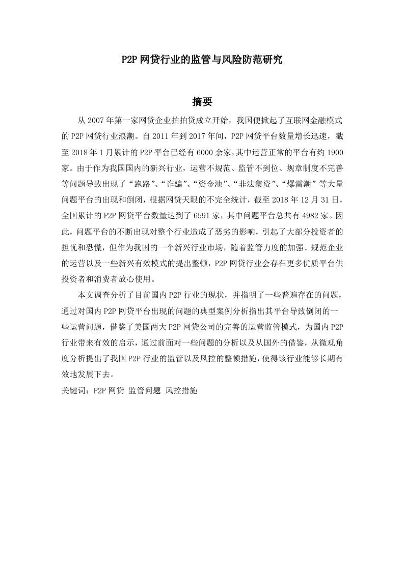 P2P网贷行业的监管与风险防范研究摘要从2007年第一家网贷企业拍拍贷成立开始,我国便掀起了互联网金融模式的P2P网贷行业浪潮。自2011年到2017年间,P2P网贷平台数量增长迅速,截至2018年1月累计的P2P平台已经有6000余家,其中运营正常的平台有约1900家。由于作为我国国内的新兴行业,运营不规范、监管不到位、规章制度不完善等问题导致出现了“跑路”、“诈骗”、“资金池”、“非法集资”、“爆雷潮”等大量问题平台的出现和倒闭,根据网贷天眼的不完全统计,截至2018年12月31日,全国累计的P2P网贷平台数量达到了6591家,其中问题平台总共有4982家。因此,问题平台的不断出现对整个行业造成了恶劣的影响,引起了大部分投资者的担忧和恐慌,但作为我国的一个新兴行业市场,随着监管力度的加强、规范企业的运营以及一些新兴有效模式的提出整顿,P2P网贷行业会存在更多优质平台供投资者和消费者放心使用。本文调查分析了目前国内P2P行业的现状,并指明了一些普遍存在的问题,通过对国内P2P网贷平台出现的问题的典型案例分析指出其平台导致倒闭的一些运营问题,借鉴了美国两大P2P网贷公司的完善的运营监管模式,为国内P2P行业带来有效的启示,通过前面对一些问题的分析以及从国外的借鉴,从微观角度分析提出了我国P2P行业的监管以及风控的整顿措施,使得该行业能够长期有效地发展下去。关键词:P2P网贷监管问题风控措施ABSTRACTIn China,since the establishment of paipaidai,the first online loan enterprise in2007,a P2P online loan industry frenzy of Internet finance mode has been set off.From 2011 to 2017,the number of P2P online lending platforms grew rapidly andemerged in an endless flow.As of January 2018,there were more than 6,000 P2Pplatforms,among which 1,906 were operating normally.As the domestic emergingindustry in our country,the operation is not standard,regulation is not in place,imperfect regulations lead to problems such as the "run","fraud","pool","illegalfund-raising","critical LeiChao"the emergence of a lot of problems,such as platformand collapse,according to the incomplete statistics of net lending eye,as of December31,2018,the cumulative number of P2P network credit platform reached 6591,theplatform has a total of 4982 problem.Appearance of question,therefore,the platformhad a bad effect on the industry,has caused the most investors fear and panic,but asan emerging industry in China market,with the strengthening of supervision,standardized operation of enterprises and some new effective model put forwardrectification,P2P network credit industry will be more excellent platform forinvestors and consumers trust.Introduction to this article elaborated the research background and significance,and some domestic scholars research the literature review,the second chapter,thepresent situation of the investigation and analysis of the current domestic P2P industry,and pointed out the some common problems,the third chapter through to the domesticproblems in P2P network credit platform for the typical case analysis points out itslead to the collapse of some operational problems,the fourth chapter draws on twoP2P network company perfect operation mode,which bring effective enlightenmentfor domestic P2P industry,the fifth chapter through the analysis of former face someproblems and reference from abroad,From the micro point of view,this paper putsforward the supervision and risk control rectification measures for China's P2Pindustry,so that the industry can develop effectively for a long time.Key words:P2P network loan supervision problem risk control measures目录第一章导论11.1研究背景及意义1.1.1研究背景1.1.2研究意义1.2研究综述现状1.2.1国内文献综述.1.2.2文献评述…1.3研究思路及方法1.3.1研究思路…31.3.2研究方法.第二章我国P2P网贷行业的发展现状以及存在的问题.2.1我国P2P网贷行业发展现状32.1.1P2P网贷行业运营现状.32.1.2P2P网贷行业监管现状52.1.3P2P网贷行业风险管理现状.52.2我因P2P网贷行业存在的问题6第三章我因P2P网贷行业存在的典型问题案例分析一一“e租宝”73.2“e租宝”平台存在的问题83.2.1运营模式中存在的问题83.2.2平台内部问题3.2.3平台外部问题9第四章发达因家P2P网贷行业特点以及监管与内部规范94.1.2 Lending Club运营模式.4.3美国的监管管理划分104.3.1多层次的外部监管体系…4.3.2相对完善的内部防控措施.114.3.3完善的信用评估系统…4.3.4借款人需求的细分12第五章我因P2P网贷行业的风险防范措施5.2.1完善法律体系监管…5.2.2完善部门监管体系.5.3提高部门监管效益…5.4投资者提高风险防范意识.16参考文献…