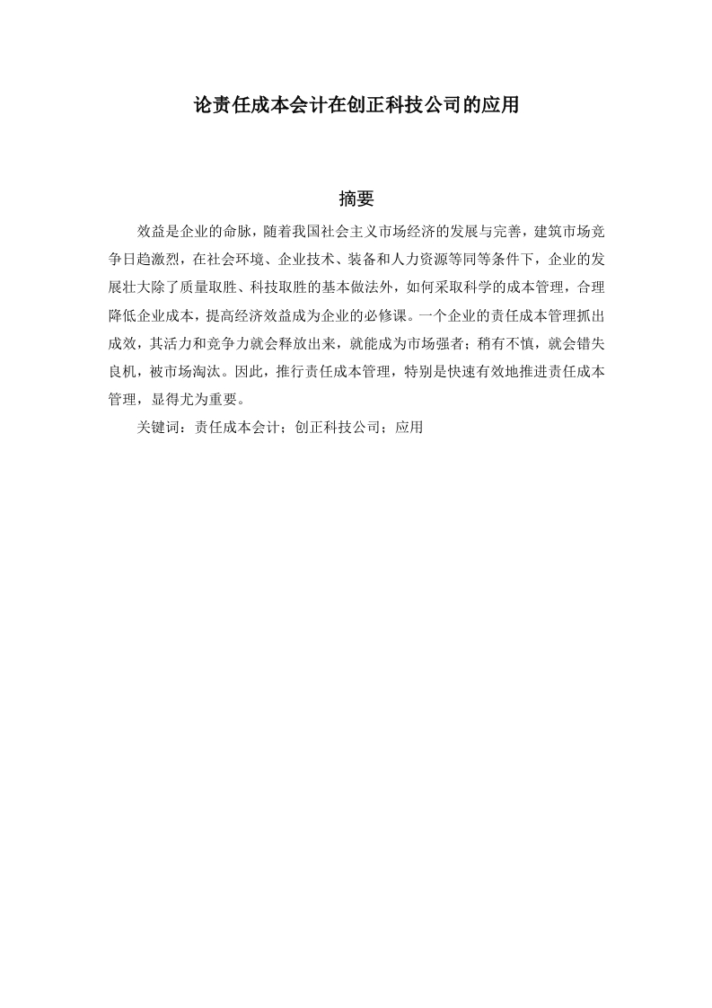论责任成本会计在创正科技公司的应用摘要效益是企业的命脉,随着我国社会主义市场经济的发展与完普,建筑市场竞争日趋激烈,在社会环境、企业技术、装备和人力资源等同等条件下,企业的发展壮大除了质量取胜、科技取胜的基本做法外,如何采取科学的成本管理,合理降低企业成本,提高经济效益成为企业的必修课。一个企业的责任成本管理抓出成效,其活力和竞争力就会释放出来,就能成为市场强者:稍有不慎,就会错失良机,被市场淘汰。因此,推行责任成本管理,特别是快速有效地推进责任成本管理,显得尤为重要。关键词:责任成本会计:创正科技公司:应用目录摘要…31.1研究背景31.2研究意义31.3研究内容32责任成本会计理论概述32.2责任成本会计…42.3责任成本会计的内容43创正科技公司责任成本会计应用现状3.1创正科技公司简介…43.2创正科技公司责任成本会计应用现状54创正科技公司责任成本管理存在的问题…64.1仅对生产成本的管理控制比较重视4.2责任成本编制与实际成本不符合…64.3责任成本出现变动调整不及时.74.4部门之间独立性不强,责任没落实到部门75创正科技公司责任成本存在的问题解决对策分析5.1提高对责任成本管理的全面意识…5.2加强责任成本编制的合理性与科学性95.3及时进行责任成本的调整公示与信息公开95.4强化各部门责任成本协同与责任职能6创正科技公司责任成本会计问题解决措施6.1必须完善成本会计责任成本的组织6.2建立和健全责任成本规章制度.6.3完善责任成本管理模式1213致谢.…1绪论1.1研究背景在二十世纪四十年代即第二次世界大战结束后,许多国家之间的接洽联系愈来愈密切,极大程度上促进了国际经济的飞速发展和日趋完善。除此之外,不断加剧的贸易竞争,强烈要求公司建立更加合理化的内部成本管理制度,使其更加合规化。在这种发展形势下,传统的集中式管理模式就不能适应快速变化的市场要求,同时还由于其传统的集中管理模式自身的缺点,如决策集中,应变能力差等问题,许多大型公司开始推行分权化的管理制度,采用事业部制的公司组织体系,这就使得责任会计受到了普遍的重视,责任会计由此诞生,并且开始在公司管理中得到良好的应用和发展。1.2研究意义责任成本会计是企业管理工作中非常重要的一个构成部分,这种管理方法减少企业成本的同时增强了企业的核心竞争力。责任成本会计是既是预防方法也是管理方法,利用技术事先对成本进行预控,用较早的收入预期提供保障,用支出的成本作为样本,最终使企业增加效益,帮助职工提供收入水平,以这样的目标作为其控制模式,整体是动态的管理过程。按照当前发展水平,企业责任成本会计工作在进行落实的时候包含以下几个方面,一是责任控制必须完整合理,成本核算制度得到完善,二是要提高内部结算制度与责任中心及其有关的预算体系水平,三是要进行责任奖惩与责任考核双重机制。1.3研究内容2责任成本会计理论慨述2.1责任成本所谓的责任成本,就是指特定的责任中心中所产生的成本费用的耗费。通俗来讲,就是按照“谁负责,谁承担”的原则,将公司责任落实到每个具体的责任部门后进行归集核算,从而正确反映出各责任部门所产生的责任利润。