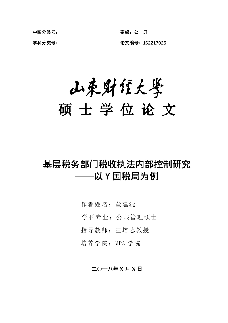 中图分类号:密级:公开学科分类号:论文编号:162217025硕士学位论文基层税务部门税收执法内部控制研究一以Y国税局为例作者姓名:董建沅学科专业:公共管理硕士指导教师:王培志教授培养学院:MPA学院二O一八年X月X日Research on Internal Control of tax Enforcement inGrass-roots tax departments-Take the Y Internal Revenue Bureau as an exampleA Dissertation Submitted for the Degree of MasterCandidate:Dong JianyuanSupervisor:Wang PeizhiSchool of MPAShandong University of Finance and Economics中图分类号:密级:公开学科分类号:论文编号:162217025硕士学位论文基层税务部门税收执法内部控制研究以Y国税局为例作者姓名:董建沅申请学位级别:公共管理硕士(MPA)指导教师姓名:王培志职称:教授学科专业:公共管理硕士研究方向:公共财政与税收管理学习时间:自2016年9月1日起至2018年6月30日止学位授予单位:山东财经大学学位授予日期:2018年6月