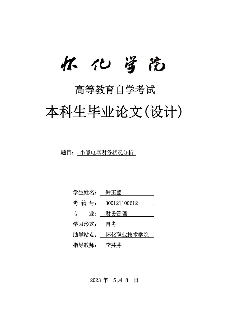 高等教育自学考试本科生毕业论文(设计)题目:小熊电器财务状况分析学生姓名:钟玉莹考籍号:300121100612专业:财务管理学习形式:自考助学站点:怀化职业技术学院指导教师:李芬芬2023年5月8日怀化学院高等教育自学考试本科毕业论文(设计)诚信声明作者郑重声明:所呈交的本科毕业论文(设计),是在指导老师的指导下,独立进行研究所取得的成果,成果不存在知识产权争议。除文中已经注明引用的内容外,论文(设计、创作)不含任何其他个人或集体已经发表或撰写过的成果。对论文(设计、创作)的研究做出重要贡献的个人和集体均已在文中以明确的方式标明。本声明的法律结果由作者承担。本科毕业论文(设计)作者签名:年月日目录摘Abstract....Key words.…一、前言二、相关概念及理论基础(一)财务管理的概念(二)财务分析的概念.…(三)财务管理与财务分析的关系.(四)风险管理理论2三、小熊电器公司财务状况分析2(一)小熊电器公司概况…2(二)财务比率分析.1.偿债能力比率分析32.营运能力比率分析33.获利能力比率分析44.发展能力比率分析.4三、小熊电器公司财务管理存在的问题(一)偿债能力减弱…5(二)营运能力减弱(三)获利能力减弱.(四)发展能力减弱…四、小熊电器公司财务管理发展建议.7(一)优化资本结构,提高偿债能力…7(二)提高周转速度,增强营运能力(三)提高利润率,增强获利能力.(四)保持稳定增长,提高发展能力五、结论参考文献11致谢12