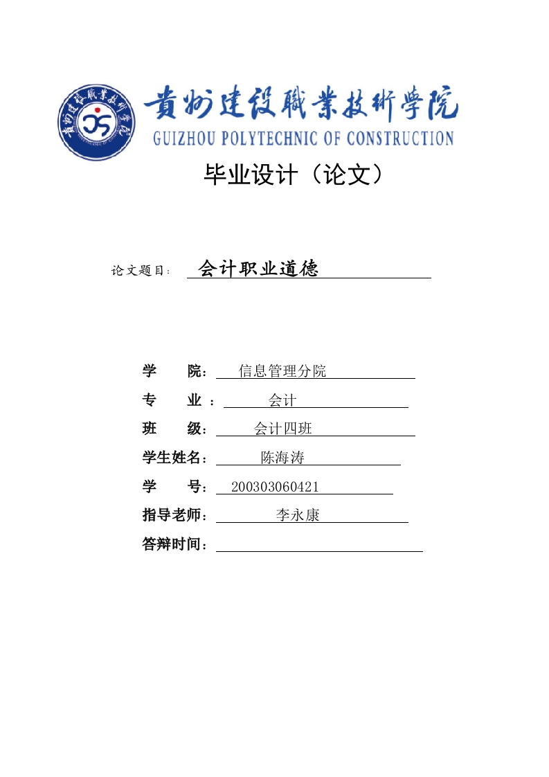 GUIZHOU POLYTECHNIC OF CONSTRUCTION毕业设计(论文)论文题目:会计职业道德学信息管理分院专会计班级:会计四班学生姓名:陈海涛学号:200303060421指导老师:李永康答辩时间:成果版权使用授权书本人完全了解贵州建设职业技术学院有关保留、使用毕业成果的规定。特授权贵州建设职业技术学院可以将成果的全部或部分内容编入有关数据库进行检索,并采用影印、缩印或扫描等复制手段保存、汇编以供查阅和借阅。同意学校向国家有关部门或机构送交论文的复印件和电子文档。(保密的成果在解密后适用本授权说明)作者签名:签字日期:年月日会计职业道德摘要当前,随着两个文明建设的不断加强,随着党风、社会风气的逐渐好转,从事财政、财务经营、管理的广大会计人员基本能遵守会计职业道德,这是主流和大方向。但毋庸讳言,仍有一部分会计人员不用社会主义的会计职业道德规范的规定来约束自己的言行,甚至还有少数会计人员对会计职业道德不管不顾,做事情只是凭着自己的主观意愿,最终违法犯罪。基于此,我们就应该加快会计职业道德建设的进程。本文首先找到会计职业道德现有的问题,对其进行分析研究,结合具体情况,最终提出适合的改进建议,从而对未来会计职业道德的发展起到一定的促进作用。关键词:会计行业;职业道德:诚信