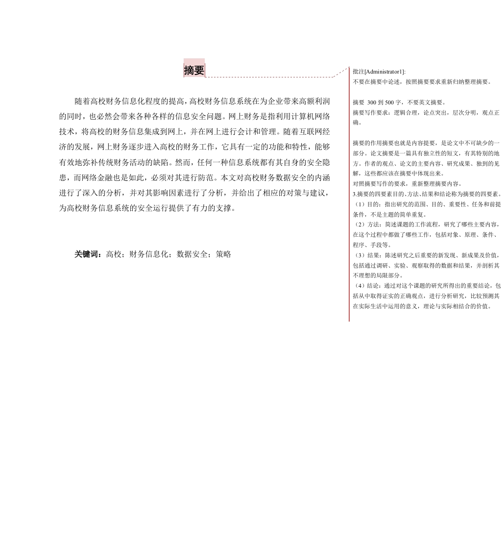 摘要批注Administratorl]:不要在摘要中论述,按照摘要要求重新归纳整理摘要。随着高校财务信息化程度的提高,高校财务信息系统在为企业带来高额利润摘要300到500字,不要英文摘要。的同时,也必然会带来各种各样的信息安全问题。网上财务是指利用计算机网络摘要写作要求:逻辑合理,论点突出,层次分明,观点正确。技术,将高校的财务信息集成到网上,并在网上进行会计和管理。随着互联网经济的发展,网上财务逐步进入高校的财务工作,它具有一定的功能和特性,能够摘要的作用摘要也就是内容提要,是论文中不可缺少的一部分。论文摘要是一篇具有独立性的短文,有其特别的地有效地弥补传统财务活动的缺陷。然而,任何一种信息系统都有其自身的安全隐方。作者的观点、论文的主要内容、研究成果、独到的见患,而网络金融也是如此,必须对其进行防范。本文对高校财务数据安全的内涵解,这些都应该在摘要中体现出来。对照摘要写作的要求,重新整理摘要内容。进行了深入的分析,并对其影响因素进行了分析,并给出了相应的对策与建议,3.摘要的四要素目的、方法、结果和结论称为摘要的四要素。为高校财务信息系统的安全运行提供了有力的支撑。(1)目的:指出研究的范围、目的、重要性、任务和前提条件,不是主趣的简单重复。(2)方法:简述课题的工作流程,研究了哪些主要内容,在这个过程中都做了哪些工作,包括对象、原理、条件、程序、手段等。关键词:高校:财务信息化;数据安全:策略(3)结果:陈述研究之后重要的新发现、新成果及价值,包括通过调研、实验、观察取得的数据和结果,并制析其不理想的局限部分。(4)结论:通过对这个课趣的研究所得出的重要结论,包括从中取得证实的正确观点,进行分析研究,比较预测其在实际生活中运用的意义,理论与实际相结合的价值。目录批注[Administrator2小:从目录看,论文结构基本合理,论证缺乏实证依据,太多一、绪论理论堆砌:(一)研究背景及意义目录有三级标题,缺摘要目录(罗马标号),(二)研究内容…从目录看结构框架基本合理,比重不合理,论述内容空泛,(三)国内外研究现状没有抓住论述的重点是“安全策略”,论证缺乏实证依据。重新调整结构重点,增加实证案例和数据论证。1.国外研究现状2.国内研究现状本科论文不分章节不用绪论,用引言或前言,前言不加一二三等题标,或直接月一段文学描述引出研究课题,一般二、相关理论概述.…....................不分级次标题,用自然段写作,比重不超过全文的10%(一)财务管理的概念…6、研究背景.研究目的和意义、研究方法文献综述等,这些内容不出现在本科论文正文中,是开题报告的内容这些(二)高校财务管理的概念2内容不出现在本科论文正文中,是开题报告或文献综述的(三)高校财务管理的特点.…1.具有很强的计划性.…2.收入来源多元化,投资多样化3.高校的非营利性导致基础财务信息不准确..3(四)高校财务系统数据安全的概念…4三、影响高校财务系统数据安全的因素…4四、高校财务网络管理工作的现状及存在的风险5(一)高校财务网络管理工作的现状5(二)财务网络数据存在的安全风险1.网络攻击风险2.网络病毒风险…63.安全意识风险…65.管理安全风险…76.信息安全风险…五、确保高校财务系统数据安全的对策…8(一)完善财务网络的内部控制制度8(二)容灾与数据备份技术.1.容灾系统82.备份系统83.权限控制…94.数据加密技术9结论10参考文献…12论文指导共性问题,有则改之正文部分一、基本要求论文包括以下要件:1.标题2.摘要300到500字,不要英文熵要。摘要写作要求:逻辑合理,论点突出,层次分明,观,点正确。3.关键词,3到5个,要求紧扣标题反应论点4目录,要求三级标题自动生成(自动生成目录,我统一讲解)5.正文,5000字到10000字,(字数不含摘要关键词,参考文献等,仅论述部分字数要求)6.参考文献10高(最好有15篇与文献综述保持一致,要求2017年到2022年发表,除经典文献)二、格式要求1.字体字号间距等按模板要求设定,查重时不做要求,但要保持格式一致2.分级标题序号严格按照:一、(一)1、(1).四级标题标准执行。不得有:1.1.1,第一节,第一章等等作为分级标题3.正文的前言引言参考文献致谢部分前不加分级标题序号4.封面,声明,致谢部分不放在查重的正文中三、论文结构要求(一)论文正文总体结构基本分为五部分(一般不少于四部分,不多于六部分)包括:引言:课题背景介绍(10%需要一段引入课题的文字,可以不要引言、前言两个字标题,有标题不要序号)一、理论论述(10%-)二、新理论和方法的提出,(论点部分,20%-)三、目标企业/项目/行业背景介绍,问题的提出(论述部分)四、各级问题的解决方法,策略,路径(论述分析)这两部分50%+五、结束语:结论(10%+)(二)要包含数据分析(三)要有图表,图表引用的要有尾注,不能是截图,标题表上图下