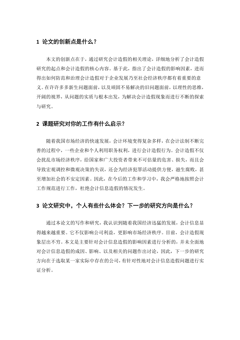 1论文的创新点是什么?本文的创新点在于,通过研究会计造假的相关理论,详细地分析了会计造假研究的起点和会计造假的核心内容。基于此,指出了会计造假的影响因素,进而得出如何防范和治理会计造假对于企业发展乃至社会经济秩序都有着重要的意义。在许许多多新生问题面前,以及顽固不易解决的旧问题面前,以理性的思维,开阔的视界,从问题的实质与根本出发,为解决会计造假现象而进行不断的探索与研究。2课题研究对你的工作有什么启示?随着我国市场经济的快速发展,会计环境变得复杂多样,在会计法制不断完善的过程中,一些企业和个人利用职务权利,进行会计造假行为。会计造假不仅会扰乱市场经济秩序,给国家和广大投资者带来不可估量的危害、损失,而且会导致宏观调控和微观决策的失误,还会为经济犯罪活动提供方便,滋生腐败,甚至增加社会的不安定因素。因此,在今后的工作和学习中,我会严格地按照会计工作规范进行工作,杜绝会计信息造假的情况发生。3论文研究中,个人有些什么体会?下一步的研究方向是什么?通过本论文的写作和研究,我认识到随着我国经济迅猛的发展,会计信息显得越来越重要。它不仅影响公司利益,更影响市场经济秩序。目前,会计造假现象层出不穷。本文是主要针对会计信息造假的影响因素进行分析的,并未全面地对会计信息造假的成因、影响、以及相关的问题作出讨论,因此,下一步的研究方向在于选取某一家实际中存在的公司,有针对性地对会计信息造假问题进行实证分析。