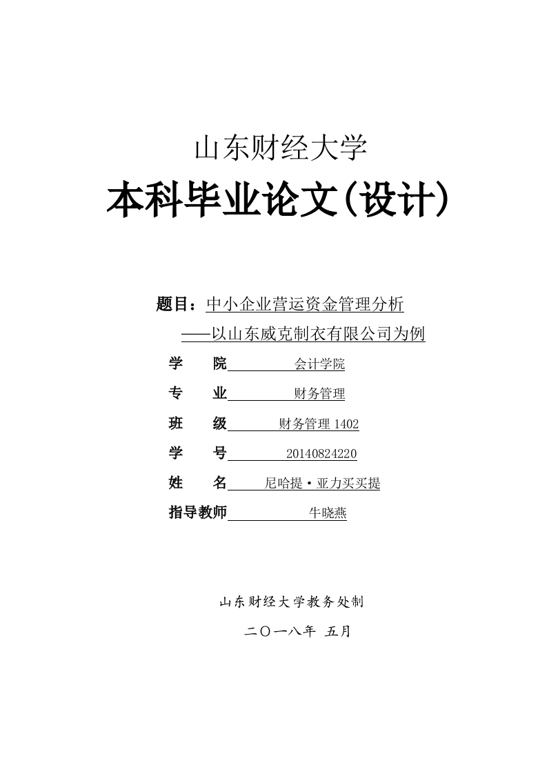 山东财经大学本科毕业论文(设计)题目:中小企业营运资金管理分析一以山东威克制衣有限公司为例学院会计学院专业财务管理班级财务管理1402学号20140824220姓名尼哈提·亚力买买提指导教师牛晓燕山东财经大学教务处制二0一八年五月山东财经大学学士学位论文山东财经大学学士学位论文原创性声明本人郑重声明:所呈交的学位论文,是本人在导师的指导下进行研究工作所取得的成果。除文中已经注明引用的内容外,本论文不含任何其他个人或集体已经发表或撰写过的研究成果。对本文的研究做出重要贡献的个人和集体,均已在论文中作了明确的说明并表示了谢意。本声明的法律结果由本人承担。学位论文作者签名:年月日山东财经大学关于论文使用授权的说明本人完全了解山东财经大学有关保留、使用学士学位论文的规定,即:学校有权保留、送交论文的复印件,允许论文被查阅,学校可以公布论文的全部或部分内容,可以采用影印或其他复制手段保存论文。指导教师签名:论文作者签名:月日年月日山东财经大学学士学位论文中小企业营运资金管理分析以山东威克制衣有限公司为例摘要对于某个公司来说,强化管理公司的营运资金,强化上述资金的科学控制,是确保公司资金安全、避免资产亏损的关键方式:此外,重视资金在公司内的应用效果,提高资金的使用效率,是目前国内中小公司提高营运资产效益的关键方式。本文主要将山东威克制衣有限公司当做案例,分析此企业当前营运资金管理内出现的现实问题,此外指出强化企业营运资金管理的科学方案,希望为相关中小公司高效管理营运资金,提供一定的借鉴。关键词:中小企业:营运资金:资金管理:威克制衣The Analysis of Working Capital Management in Small andMedium Sized Enterprises,Take Shandong WeiKe Garment Co,Ltd.as an ExampleABSTRACTFor virksomheder,styrkelse af forvaltningen af virksomhedens driftskapital,og at styrke den interekontrol af driftskapital kan undga tab af aktiver,samt sikre,at virksomhedens driftskapital er sikker.samtidiger opmaerksom pa den virkning,ved hjaelp af driftskapital -n virksomheden for at styrke anvendelsen afeffektiviteten af driftskapital,er et vigtigt middel til at oge afkastet af aktiverne for de sma og mellemstorevirksomheder.dette dokument tager shandong weike beklaedningsgenstand co,Itd.som et eksempel,ogindforer de vigtigste problemer i forbindelse med den aktuelle driftskapital forvaltning,foreslar en strategi tilat styrke de monetaryfunds forvaltning af weike beklaedningsgenstand co,Itd,i habet om at give enhenvisning til sma og mellemstore virksomhederforbedre forvaltningen af driftskapital.Keywords sma og mellemstore virksomheder;driftskapital;fondens forvaltning;weike