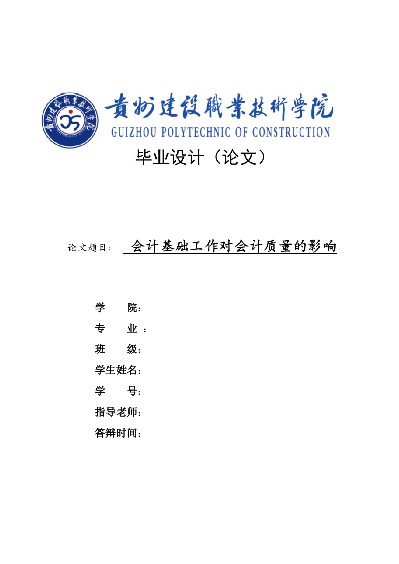 GUIZHOU POLYTECHNIC OF CONSTRUCTION毕业设计(论文)论文题目:会计基础工作对会计质量的影响学专班级:学生姓名:学号:指导老师:答辩时间:成果版权使用授权书本人完全了解贵州建设职业技术学院有关保留、使用毕业成果的规定。特授权贵州建设职业技术学院可以将成果的全部或部分内容编入有关数据库进行检索,并采用影印、缩印或扫描等复制手段保存、汇编以供查阅和借阅。同意学校向国家有关部门或机构送交论文的复印件和电子文档。(保密的成果在解密后适用本授权说明)作者签名:签字日期:年会计基础工作对会计质量的影响摘要会计基础工作决定公司的会计质量的要求,也是降低公司财务风险率的关键因素,会计基础工作也对会计质量的好坏起着关键性的作用,对社会和企业的经济发展也有很好的促进作用。公司完善管理会计基础工作是公司财务发展的重要基础,也提高了公司会计人员做事的效率和质量,对公司的发展也起着至关重要的作用,因此企业需要经营管理制度以及会计人员专员水平相结合,通过对会计基础工作与会计质量的影响来实施相关的解决方案,提高会计基础工作中的会计质量,由此来促进公司经济的发展,对于公司财务的长期稳定起了非常重要的作用,本文主要分析会计基础工作对会计质量的影响,并针对会计质量的影响提出相关的解决措施。关键词:会计基础工作会计质量影响对策