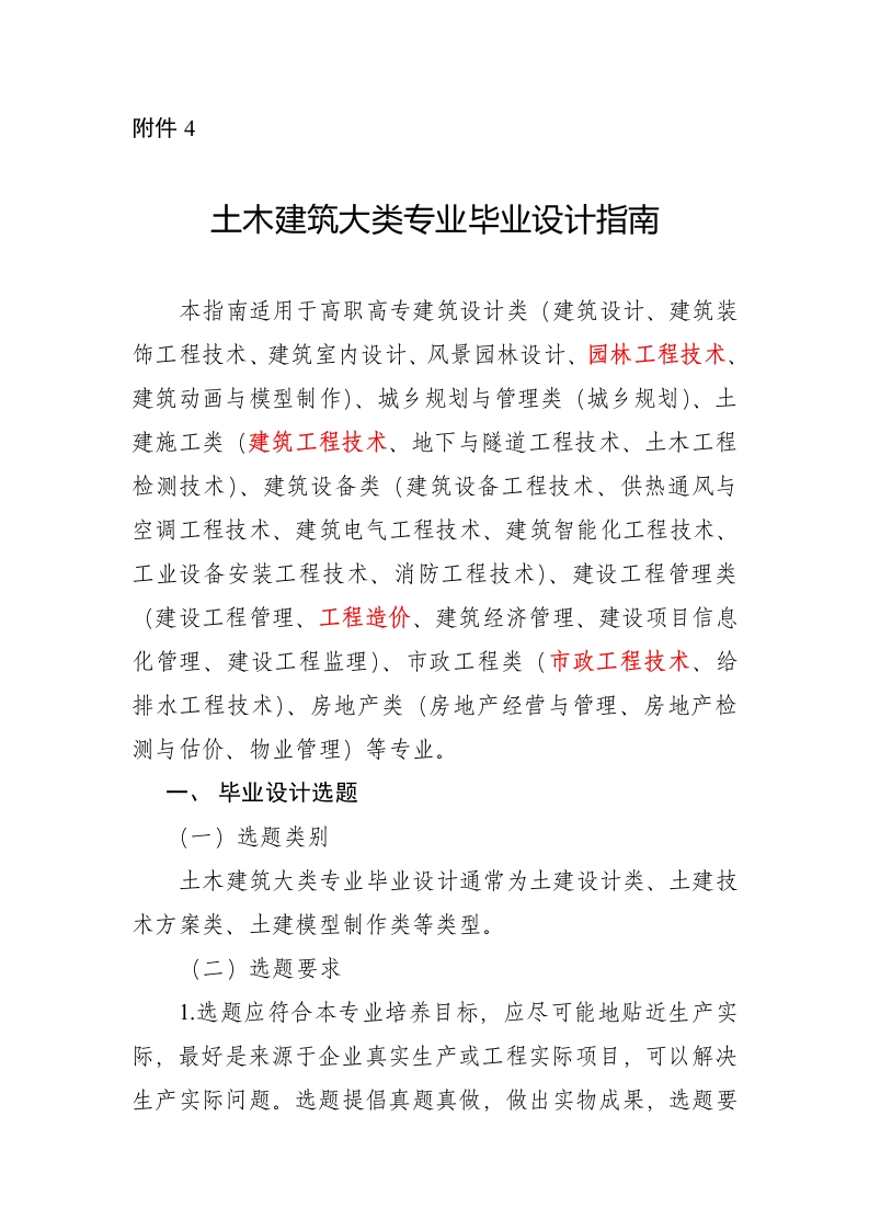 附件4土木建筑大类专业毕业设计指南本指南适用于高职高专建筑设计类(建筑设计、建筑装饰工程技术、建筑室内设计、风景园林设计、园林工程技术、建筑动画与模型制作)、城乡规划与管理类(城乡规划)、土建施工类(建筑工程技术、地下与隧道工程技术、土木工程检测技术)、建筑设备类(建筑设备工程技术、供热通风与空调工程技术、建筑电气工程技术、建筑智能化工程技术、工业设备安装工程技术、消防工程技术)、建设工程管理类(建设工程管理、工程造价、建筑经济管理、建设项目信息化管理、建设工程监理)、市政工程类(市政工程技术、给排水工程技术)、房地产类(房地产经营与管理、房地产检测与估价、物业管理)等专业。一、毕业设计选题(一)选题类别土木建筑大类专业毕业设计通常为土建设计类、土建技术方案类、土建模型制作类等类型。(二)选题要求1选题应符合本专业培养目标,应尽可能地贴近生产实际,最好是来源于企业真实生产或工程实际项目,可以解决生产实际问题。选题提倡真题真做,做出实物成果,选题要有综合性和典型性,能体现学生进行方案设计、施工图设计、模型制作、施工组织设计、成本核算、工程造价计算、测绘操作等专业综合能力和安全环保、创新协作等意识的培养要求。2.选题应大小适中、难易适度,难易度和工作量应适合学生的知识和能力状况,使学生在规定的时间内工作量饱满,且能完成任务。3.毕业设计宜做到“一人一题”,选题避免雷同。对于工作量大的毕业设计课题,可以几个学生分工协作,但是必须明确每个学生各自的任务,每个学生的毕业设计成果要有差异,不能雷同。(三)选题示例1.土建设计类(1)长沙县新农村规划设计(2)新希望幼儿园建筑方案设计(3)宏业办公楼建筑施工图设计(4)宏业办公楼结构施工图设计(5)宏业办公楼给排水设计(6)宏业办公楼暖通空调设计(7)公寓电气施工图设计(8)株洲市汽车城D区6栋给排水项目设计(9)交警三大队综合楼综合布线初步设计(10)湖南城建职业技术学院教学楼弱电设计(11)大成国际办公楼空调系统设计(12)九华住宅小区风景园林方案设计(13)九华住宅小区风景园林施工图设计(14)万达文华酒店大堂装饰方案设计(15)万达文华酒店大堂装饰施工图设计(16)东方住宅小区装配式建筑施工图深化设计2.土建技术方案类(1)宏业办公楼施工组织设计(2)南墙公租房人工挖孔桩专项施工方案编制(3)新向维办公大楼监理大纲、监理规划、监理实施细则编制(4)金鑫宾馆招投标文件编制(5)XX学校6号学生宿舍工程造价文件编制(6)中心医院住院大楼BM建模与施工模拟(7)美的·国宾府房地产项目可行性研究报告编制(8)金侨世纪苑荟茗轩E一3C住宅抵押(拍卖、拆迁等)估价报告编制(9)上层国际B座608号住宅验房报告编制(10)潭城步行街A区7号商铺房地产抵押价值评估报告编制(11)长沙观澜湖项目会计核算(12)湘潭东方名苑小区物业管理方案