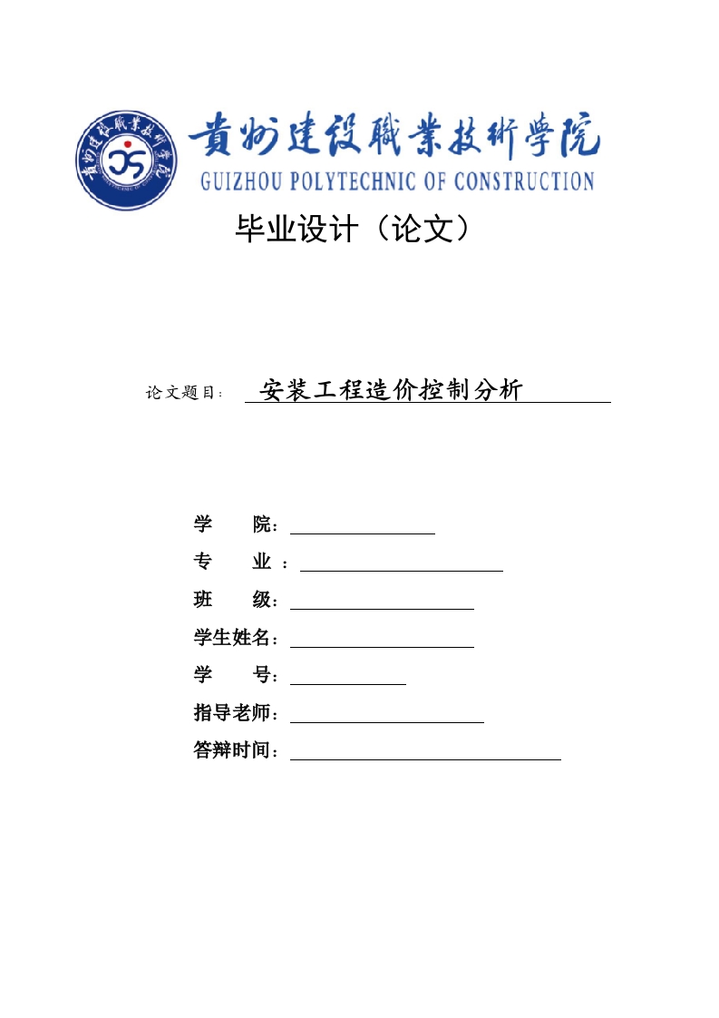 GUIZHOU POLYTECHNIC OF CONSTRUCTION毕业设计(论文)安装工程造价控制分析学专业班级:学生姓名:学号:指导老师:答辩时间:成果版权使用授权书本人完全了解贵州建设职业技术学院有关保留、使用毕业成果的规定。特授权贵州建设职业技术学院可以将成果的全部或部分内容编入有关数据库进行检索,并采用影印、缩印或扫描等复制手段保存、汇编以供查阅和借阅。同意学校向国家有关部门或机构送交论文的复印件和电子文档。(保密的成果在解密后适用本授权说明)作者签名:签字日期:年月日安装工程造价控制分析摘要从目前的发展来看,整个建筑行业均开始进入高速发展阶段,建筑企业的市场也变得更加庞大,很多房地产企业为实现利益最大化,开始实施多种手段来降低成本,为企业的发展获得更大的成长空间。在各种原材料上涨的背景下,对房地产企业而言,需要做好工程造价控制,这可更好的控制成本,对建筑企业的可持续发展起到十分重要的作用,可更好的稳固房地产企业的良性发展。在建筑工程项目实施的过程中,需要做好造价控制工作。本文以A项目作为研究对象,对其项目开展中的各种影响因素进行分析,同时注重从资源以及人力乃至环境和技术等方面展开分析,分析工程造价的具体问题,提出解决方案,帮助A项目及安装施工企业更好的开展造价控制,提高企业的竞争力和盈利能力。关键词:造价控制:成本管理:工程变更