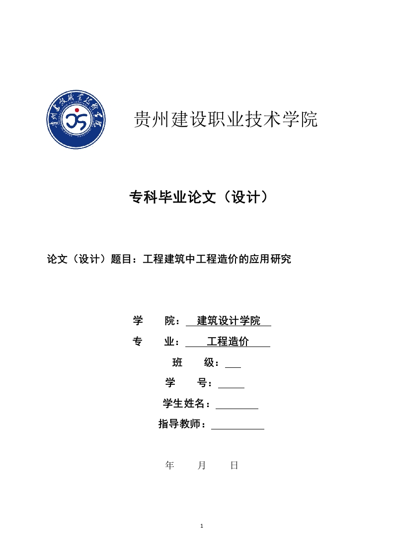 贵州建设职业技术学院专科毕业论文(设计)论文(设计)题目:工程建筑中工程造价的应用研究学院:建筑设计学院专业:工程造价班级:学学生姓名:指导教师:年月日贵州建设职业技术学院专科毕业论文(设计)诚信责任书本人郑重声明:本人所呈交的毕业论文(设计),是在导师的指导下独立进行研究所完成。毕业论文(设计)中凡引用他人已经发表或未发表的成果、数据、观点等,均已明确注明出处。特此声明。论文(设计)作者签名:日期:2目录1引言12工程造价理论12.1工程造价的含义12.2工程造价的特点.22.3工程造价的作用…23建筑工程造价…33.1建筑工程造价的特点33.2国内外工程造价模式比较…33.2.1国外的建筑造价模式3.2.2国内的建筑造价模式…4工程造价管理在学校建设项目中的改进策略4.1进行科学合理的基建项目前期决策…44.2加强限额设计合理确定工程造价43做好设备材料的认质认价工作…4.4提高高校基建项目审计效率和质量.5结论…7参考文献9