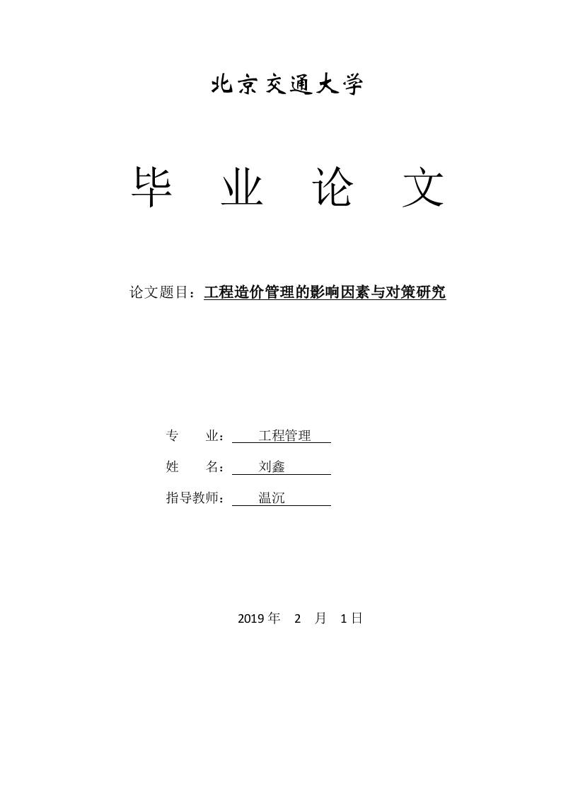 北京交通大学毕业论文论文题目:工程造价管理的影响因素与对策研究专业:工程管理姓名:刘鑫指导教师:温沉2019年2月1日毕业论文成绩评定指导教师评阅意见:成绩评定:指导教师:年月日目录绪论(一)研究背景及意义(仁国内外研究现状1.1国外研究现状。。。。。。。。11.2国内研究现状2二工程造价理论概要()工程造价的管理实施侧施工阶段全过程造价管理存在的问题三我国建筑工程造价管理现状及影响因素63.1建筑工程建设前期63.1.1投资决策阶段63.1.2建筑工程设计阶段63.2招投标阶段..3.2.1政府干预..63.2.2违规招投标..63.3施工阶段..3.3.1设计变更及现场签证3.3.2施工成本与施工质量893.4.1违规套用定额标准93.4.2虚报建筑工程量或金额93.4.3相关法规不全9