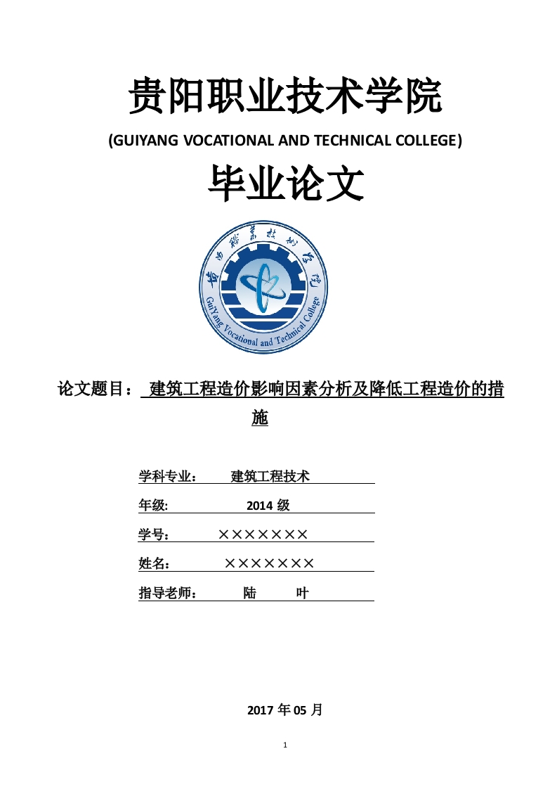 贵阳职业技术学院(GUIYANG VOCATIONAL AND TECHNICAL COLLEGE)毕业论文论文题目:建筑工程造价影响因素分析及降低工程造价的措施学科专业:建筑工程技术年级:2014级学号:XXXXXXX姓名:指导老师:陆叶2017年05月目录第2章建设工程造价相关理论2.1工程造价的概念2.2工程造价的构成…第3章影响建筑工程造价的主要因素…3.1招投标方面的因素.…23.1.1招投标风险不明确23.1.2招投标标准体系不完善.…33.2施工前期方面的因素33.2.1缺乏科学的建设投资规划.3.2.2项目设计工作没有合理规划43.3施工过程方面的因素…43.3.1施工工程中管理不善3.3.2专业人员方面影响.…43.4竣工结算方面的因素…3.4.1竣工结算审核不严第4章降低工程造价的具体措施…4.1建立完善的市场监督体系…64.2加强设计过程中造价控制.…64.3提高工程造价管理人员素质4.4重视工程施工阶段的造价控制…结论1010致谢…11摘要建设项目成本是建设项目管理的重要环节,要想做好这一工作,既保证了项目的质量,又能使企业的经济利益最大化。但是,在工程项目建设中,因决策失误、设计不合理、施工工艺不规范等原因,导致工程造价长期居高不下。为使工程的经济、社会效益最大化,加强项目造价管理,从决策、设计准备、招投标、施工、竣工等各个环节进行成本控制,建立目标明确的工程造价管理办法,使工程造价保持在合理范围内,建设项目管理的不断提升,实现更好发展。随着人们的生活水平的提高,工程建设问题日益引起人们的关注。但是随着施工项目的增加,建筑行业竞争日趋激烈。要在激烈的市场竞争中立足,增强企业的整体竞争力,就必须对工程造价进行严格的控制。保证质量,保证工期,降低造价。另外,业主、工程造价咨询等方面的工作对工程造价的影响也不容忽视。基于此,文章就影响施工成本的因素和减少成本的措施进行了探讨。