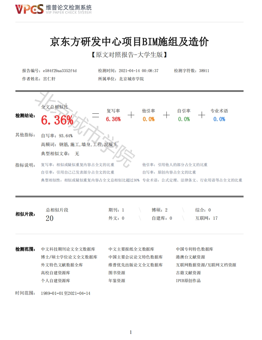 维普论文检测系统VIP PAPER CHECK SYSTEM京东方研发中心项目BIM施组及造价【原文对照报告-大学生版】报告编号:e584f29aa3352f4d检测时间:2021-04-1400:08:37检测字符数:38911作者姓名:宫仁轩所属单位:北京城市学院全文总相似比复写率他引率自引率专业术语检测结论:6.36%6.36%0.0%0.0%0.0%其他指标:自写率:93.64%高频词:钢筋,施工,墙身,工程,混凝土典型相似文章:无指标说明:复写率:相似或疑似重复内容占全文的比重他引率:引用他人的部分占全文的比重自引率:引用自己已发表部分占全文的比重自写率:原创内容占全文的比重典型相似性:相似或疑似重复内容占全文总相似比超过30%专业术语:公式定理、法律条文、行业用语等占全文的比重总相似片段期刊:1博硕:2综合:0相似片段:20外文:0自建库:0互联网:17检测范围:中文科技期刊论文全文数据库中文主要报纸全文数据库中国专利特色数据库博士/硕士学位论文全文数据库中国主要会议论文特色数据库港澳台文献资源外文特色文献数据全库维普优先出版论文全文数据库互联网数据资源/互联网文档资源高校自建资源库图书资源古籍文献资源个人自建资源库年鉴资源IPUB原创作品时间范围:1989-01-01至2021-04-14VPCS维普论文检测系统VIP PAPER CHECK SYSTEM原文对照颜色标注说明:■自写片段■复写片段(相似或疑似重复)口引用片段(引用)■专业术语(公式定理、法律条文、行业用语等)1工程概况1.1项目基本情况1.工程名称:京东方B38研发中心2.工程地点:朝阳区酒仙桥路3.建筑地区特点:(1)该工程建筑面积为:14850m2,其中地上10550平米,地下4300平米。项目名称京东方B38研发中心备注耐火等级二级抗震设防烈度8度主要结构形式框架剪力墙建筑层数8层(±0.000以上)建筑计算高度36.45米总建筑面积14850m墙体填充墙建地面水泥砂浆铺面及装修层同上筑楼面钢筋混凝土抹灰及装修面层同上构屋面柔性十刚性防水造门木质防火门,无框地弹簧玻璃门及窗钛金色铝合金框、无色玻璃(中空)装混合砂浆、水泥砂浆修内墙面混合砂浆、水泥砂浆外墙面浅灰色平面图、立面图、剖面图展示2维普论文检测系统VIP PAPER CHECK SYSTEM41.2现场条件1.本工程施工图设计已完成并审核,施工场内无建筑物,施工用水用电能满足供给要求,场地三通一平工作已完成,具备入场施工条件。2.工程量较大,施工技术复杂、相对投入集中、量大。3