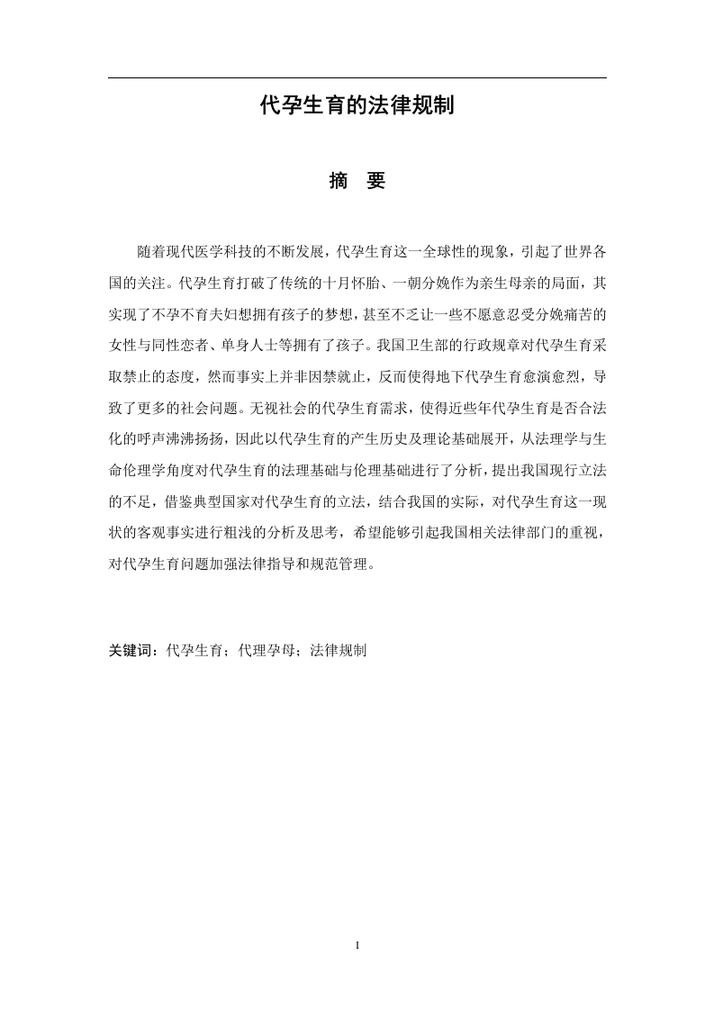 代孕生育的法律规制摘要随着现代医学科技的不断发展,代孕生育这一全球性的现象,引起了世界各国的关注。代孕生育打破了传统的十月怀胎、一朝分娩作为亲生母亲的局面,其实现了不孕不育夫妇想拥有孩子的梦想,甚至不乏让一些不愿意忍受分娩痛苦的女性与同性恋者、单身人士等拥有了孩子。我国卫生部的行政规章对代孕生育采取禁止的态度,然而事实上并非因禁就止,反而使得地下代孕生育愈演愈烈,导致了更多的社会问题。无视社会的代孕生育需求,使得近些年代孕生育是否合法化的呼声沸沸扬扬,因此以代孕生育的产生历史及理论基础展开,从法理学与生命伦理学角度对代孕生育的法理基础与伦理基础进行了分析,提出我国现行立法的不足,借鉴典型国家对代孕生育的立法,结合我国的实际,对代孕生育这一现状的客观事实进行粗浅的分析及思考,希望能够引起我国相关法律部门的重视,对代孕生育问题加强法律指导和规范管理。关键词:代孕生育:代理孕母:法律规制The Legal Regulating of the Surrogate BirthAbstractWith the continuous development of modern medical science and technology,theglobal phenomenon of surrogacy has attracted worldwide attention.Surrogate birth,broke the traditional October be pregnant the birth as the biological mother of thesituation,the achieved the dream of infertile couples want to have children,and evensome some not willing to endure pain of childbirth women and gay men,such assingle people have children.China's ministry of health administrative rules for asurrogate birth ban attitude,but in fact,not because they check,makes theunderground surrogate birth intensified,leading to more social problems.Ignore socialsurrogate birth demand,makes the legalization of surrogate birth whether in recentyears,so on the basis of the history and theory of surrogate birth,from the Angle ofjurisprudence and bioethics surrogate birth and ethical basis of the basic theories areanalyzed,put forward the shortcomings of the current legislation in our country,drawlessons from the typical national legislation of surrogate birth,combines the actualconditions of our country,the objective fact of surrogate birth this superficial analysisand thinking,want to be able to cause the attention of the relevant legal department inChina,strengthen the legal problems of surrogate birth to guide and standardizemanagementKey Words:Surrogate birth Surrogate motherhood;Legal regulation目录摘要Abstract-目录一、代孕生育产生的历史及理论基础(一)代孕生育产生的历史-1(二)代孕生育的理论基础--1二、我国代孕生育的现状及思考(一)我国代孕生育的现状3(二)我国现行法之思考三、国内外代孕生育的立法现状及评析6(一)典型大陆法系国家的立法现状,(二)典型英美法系国家的立法现状-7(三)对各国现行立法的评析-四、我国代孕生育的法律制度的完善(一)完善我国现行立法(二)完善我国代孕生育的法律制度设计-10参考文献-12