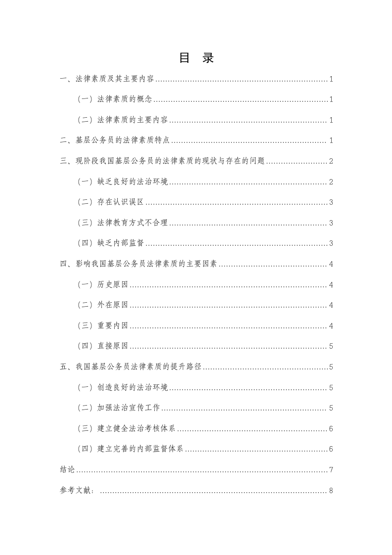 目录一、法律素质及其主要内容…1(一)法律素质的概念…1(二)法律素质的主要内容二、基层公务员的法律素质特点.…1三、现阶段我国基层公务员的法律素质的现状与存在的问题.…2(一)缺乏良好的法治环境.…2(二)存在认识误区.3(三)法律教育方式不合理…3四、影响我国基层公务员法律素质的主要因素.…4(三)重要内因.(四)直接原因.五、我国基层公务员法律素质的提升路径.5(一)创造良好的法治环境.…(二)加强法治宣传工作.…5(三)建立健全法治考核体系…6(四)建立完善的内部监督体系…67参考文献:致谢9论我国基层公务员法律素质的提升涂玥摘要:当前,我国法制建设程度逐渐加深,社会各界对于我国公民的法律素质极为关注。而基层公务员队伍作为我国重要的执法队伍,基层公务员队伍的法律素质更被社会所关注。基层公务员群体的法律素质是衡量我国法治建设的重要指标,因此必须要加以重视,但是就目前而言,我国基层公务员队伍的法律素质还存在很大的问题。本文就如何提升我国基层公务员法律素质作为研究方向。通过查找大量的问题,在明确法律素质的概念和主要内容的基础之上,分析了基层公务员的法律素质特点,找寻了我国基层公务员队伍当前法律素质存在的问题,最后提出具体的解决建议。希望通过本文的研究,能够帮助我国基层公务员队伍完善法律素质。关键词:基层公务员;法律素质;法治建设一、法律素质及其主要内容(一)法律素质的概念法律素质是以法为基础,是一个群体对于法律内涵的掌握与了解,以及对于法律的遵守。公民法律素质的内容受到了法律内涵的影响,对于公民的法律素质起到一定的指导作用。在对于法的概念进行解释时,很多专家都是以马克思主义的相关概念作为基础,再由此进一步展开。本文在参考了大量文献后,认为法律素质的概念,是一个国家在具备健全法律的基础上,公民对于法律内容的了解以及认定,并能自觉遵守法律的能力四。(二)法律素质的主要内容法律知识以及法律意识共同组成了法律素质。以下我们将分别对于法律意识和法律知识进行简要介绍。在现实社会中人们对于法律的感知、认同等方面的心理要素的综合体所构成的一种较为特殊的社会意识体系称之为法律意识。基层公务员属于国家的公职人员必须培养自身的法律意识,不断的加强自身的法律素质。基层公务员对于法律所具有的自身看法和评价就是法律意识的体现,形成完善的法律意识是基层公务员发展自身法律素质的基础冈知识是人的大脑对于客观事物以及事物发展规律反映在头脑中的存储所形成的意识体系。法律知识是法律素质重要的组成部分,基层公务员发展自身的法律素质首先需要积累丰富的法律知识。专业性法律知识、理论性法律知识以及普及性的法律知识共同构成了基层公务员的法律知识体系。专业性的法律知识是指基层公务员做具有的与自身职位、部门相符合的法律知识。基层公务员所具有的理论性法律知识则主要是指基层公务员所具有的关于法律本质等方面的法律知识。普及性的法律知识主要是指基层公务员所具有的关于社会和生活的常识性法律知识。1