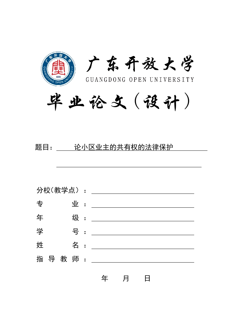 广东开放大学GUANGDONG OPEN UNIVERSITY题目:论小区业主的共有权的法律保护分校(教学点)专业年级学号姓名指导教师年月日毕业论文(设计)诚信声明本人所呈交的毕业论文(设计),是在指导教师指导下进行研究工作所取得的成果,所有数据、图片资料均真实可靠。除文中己经注明引用的内容外,本毕业论文(设计)的研究成果不包含任何他人己公开发表或者没有公开发表的作品或成果。对本论文(设计)所涉及的研究工作做出贡献的其他个人和集体,均己在文中以明确方式标明。本人完全意识到本声明的法律责任由本人承担。作者签名:日期:年月日毕业论文(设计)版权使用授权声明本人完全了解广东开放大学关于收集、保存、使用毕业论文(设计)的规定,同意如下各项内容:按照学校要求提交论文(设计)的印刷本和电子版本:学校有权保存论文(设计)的印刷本和电子版,并采用影印、缩印、扫描、数字化或其它手段保存论文;学校有权提供目录检索以及提供本毕业论文(设计)全文或者部分的阅览服务,以及出版毕业论文(设计);学校有权按有关规定向国家有关部门或者机构送交论文的复印件和电子版:在不以赢利为目的的前提下,学校可以适当复制论文的部分或全部内容用于学术活动。作者签名:日期:年月日摘要目前,随着我国社会不断发展,人们日常生活中的各类需求越来越多。如何保障我国业主的共有权进而实现业主共有权益已成为一个社会热点问题。业主共有权作为业主共同对小区进行自治管理的权利基础,涉及到全体业主的合法权益,该权利的价值在于如何能够通过共有权的行使进而真正为业主带来利益。然而,在实践中,立法上的不完善阻碍了业主共有权的实现,此外一些其他因素也造成了业主在行使共有权时面临困境,导致业主不能有效行使共有权从而享有对应的合法权益。因此,为了解决业主难以行使共有权这一问题,本文将以我国现有的建筑物区分所有权制度为基础,结合实践对我国有关规定进行研究,分析我国业主共有权的行使所面临的困境,对如何保证业主有效实现共有权提出自己的意见和建议。关键词:业主共有权,权利行使,实现路径