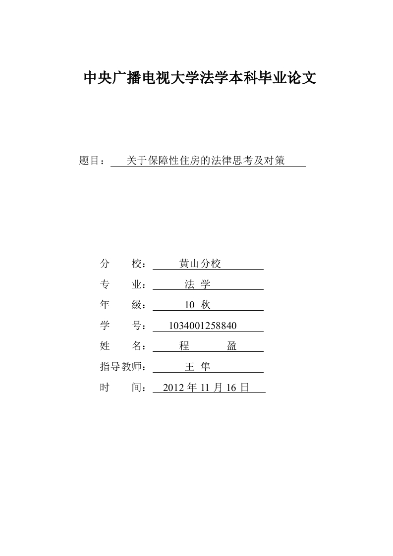 中央广播电视大学法学本科毕业论文题目:关于保障性住房的法律思考及对策分校:黄山分校专业:法学年10秋学号:1034001258840姓名:程盈指导教师:王隼时间:2012年11月16日目录(一)保障性住房建设的历史、背景(二)保障性住房制度改革.··22(一)我国保障性住房法律制度的法律基础2(二)现有的住房保障政策.3(三)现有住房保障政策发挥的作用3(四)现有的住房保障政策存在的不足4(五)国外或地区先进的住房保障政策....4三、完善保障性住房立法的对策.·(一)住房保障立法的宪法依据...566(四)住房保障收入的标准划分.·6(五)住房保障资金的渠道来源及房源供应保障....67四、结语参考文献…关于保障性住房的法律思考及对策姓名:程盈学号:1034001258840【内容摘要】住房保障制度是社会保障制度的重要组成部分之一,相对而言,发达国家的住房保障立法已经较为完备,虽然中国也制定了一些这方面的规章和地方性法规,但我国住房保障方面的立法还十分欠缺。文章在对我国住房保障法律制度的发展进行回顾,对国外先进制度进行分析,对我国现行住房保障制度进行分析。2007年8月13日,国务院正式发布《关于解决城市低收入家庭住房困难的若干意见》(〔国发(2007)24号),下简称“意见”),“意见”对建立我国的住房保障制度具有里程碑式的意义。该“意见”明确指出“城市廉租住房制度是解决低收入家庭住房困难的主要途径”。2008年,《住房保障法》被列入11届全国人大常委会五年立法规划,但由于牵涉的利益主体比较多,争议也就比较多,2012年4月《住房保障法》,“退格”为《基本住房保障条例》(以下简称《条例》),对保障性住房的定义、功能、法律地位等进行原则性的规定,并对保障房的“公平分配”和退出机制以及相关的方式和路径进行规定。本文试从法学的角度对我国住房保障制度提出一些立法建议。【关键词】住房保障:基本情况;制度分析;对策建议2
