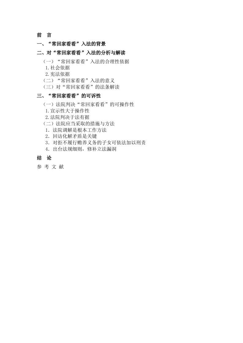 前言一、“常回家看看”入法的背景二、对“常回家看看”入法的分析与解读(一)“常回家看看”入法的合理性依据1.社会依据2.宪法依据(二)“常回家看看”入法的意义(三)对“常回家看看”的法条解读三、“常回家看看”的可诉性(一)法院判决“常回家看看”的可操作性1.宣示性大于操作性2.法院判决于法有据(二)法院应当采取的措施与方法1.法院调解是根本工作方法2.回访化解矛盾是关键3.对拒不履行赡养义务的子女可依法加以刑责4.出台法规细则,修补立法漏洞结论参考文献