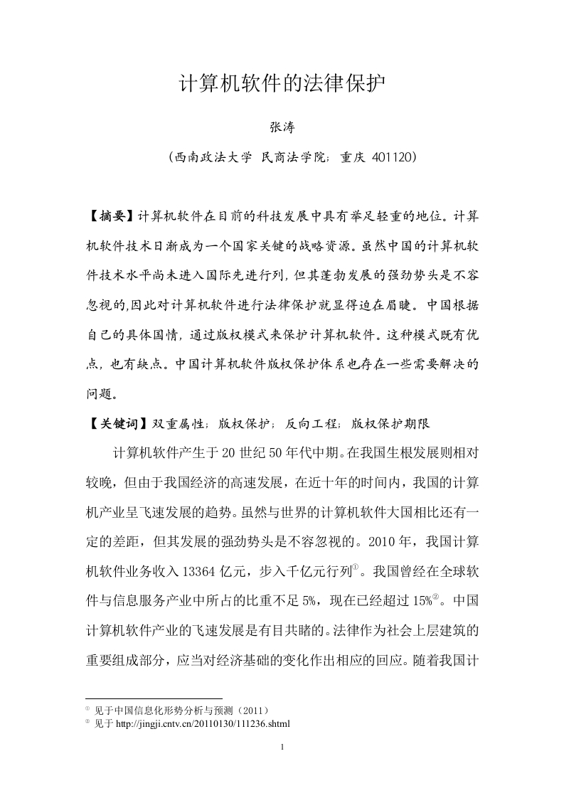 计算机软件的法律保护张涛(西南政法大学民商法学院;重庆401120)【摘要】计算机软件在目前的科技发展中具有举足轻重的地位。计算机软件技术日渐成为一个国家关键的战略资源。虽然中国的计算机软件技术水平尚未进入国际先进行列,但其蓬勃发展的强劲势头是不容忽视的,因此对计算机软件进行法律保护就显得迫在眉睫。中国根据自己的具体国情,通过版权模式来保护计算机软件。这种模式既有优,点,也有缺,点。中国计算机软件版权保护体系也存在一些需要解决的问题。【关键词】双重属性;版权保护;反向工程;版权保护期限计算机软件产生于20世纪50年代中期。在我国生根发展则相对较晚,但由于我国经济的高速发展,在近十年的时间内,我国的计算机产业呈飞速发展的趋势。虽然与世界的计算机软件大国相比还有一定的差距,但其发展的强劲势头是不容忽视的。2010年,我国计算机软件业务收入13364亿元,步入千亿元行列”。我国曾经在全球软件与信息服务产业中所占的比重不足5%,现在已经超过15%®。中国计算机软件产业的飞速发展是有目共睹的。法律作为社会上层建筑的重要组成部分,应当对经济基础的变化作出相应的回应。随着我国计①见于中国信息化形势分析与预测(2011)http://jingji.cntv.cn/20110130/111236.shtml1算机软件市场的蓬勃发展,计算机软件产业对国民经济的贡献越来越大,对计算机软件的保护制度也应当随之建立起来。计算机软件的法律保护包括计算机软件的知识产权法保护、计算机软件的行政法保护、计算机软件的经济法保护、计算机软件的刑法保护等多种保护方式。其中对计算机软件保护力度最大,同时也是最直接的保护方式就是计算机软件的知识产权保护。本文将从知识产权法的角度,探讨计算机软件版权法保护的优劣,以及我国计算机软件版权保护模式存在的一些问题。一、计算机软件的内涵、特征以及计算机软件法律保护的重要性(一)计算机软件的内涵与特征所谓计算机软件,就是指计算机系统中的程序和文档,程序是计算任务的处理对象和处理规则的描述:文档是为了便于了解程序所需的阐明性资料”。其中计算机程序由源程序和目标程序组成,源程序是指用高级语言和汇编语言所编写的程序,目标程序是指源程序经过编译或者解释后可以由计算机直接执行的程序。文档一般是由自然语言或者形式化语言所编写的文字资料和图表,用于描述程序的内容、组成、设计、功能规格、开发情况、测试结果以及使用方法。计算机软件同时具有以下三个特征:1.计算机软件作为法律保护的客体具有双重属性一一作品性与工具性。计算机软件的工具性尤为重要。计算机软件由程序与文档两部分组成。程序由源程序和目标程序组成。源程序通常由计算机高级D见于htp:/baike.baidu.com/view/8318.htm2语言编写,包括Basic、Algol、Cobol、Fortran等语言。这些语言的表现形式是数字、文字和符号的组合,构成符号化的指令序列或者符号化的语句序列,与传统的文字作品相似。文档是由自然语言或者形式化语言编写的文字资料和图表,用于阐述程序的相关信息,也是一种文字作品。源程序与文档的内容体现了计算机软件的作品性。目标程序是用机器语言编制的表现为电磁脉冲序列的一连串二进制数(0和1)指令编码,直接用于驱动计算硬件的工作,使计算机系统发挥各项功能,获得一定的结果。计算机软件的目标程序就体现了计算机软件的工具性。四2.计算机软件使用寿命短。因为计算机软件产业不同于传统产业,其具有高速发展,跟新换代快的特征,计算机软件的使用寿命同样也很短。计算机行业著名的摩尔定律指出,每18个月计算机的性能将提高一倍。一般计算机软件使用价值的生命周期为3到5年,最长不超过5到8年。3.计算机软件开发工作量大,成本高,但复制容易,且复制成本极低。计算机软件的开发必须经过功能限定,逻辑设计和编码三个步骤,需要开发人员具有丰富的专业知识,相应的技术设备,以及充足的开发时间。因此计算机软件的研发成本与其他复杂的工业产品一样,都是非常巨大。但是由于计算机软件自身的特点,复制计算机软件的成本是极低的。这就导致了计算软件的盗版猖獗,并且这种盗版行为难以察觉与惩罚。②(二)计算机软件法律保护的重要性3