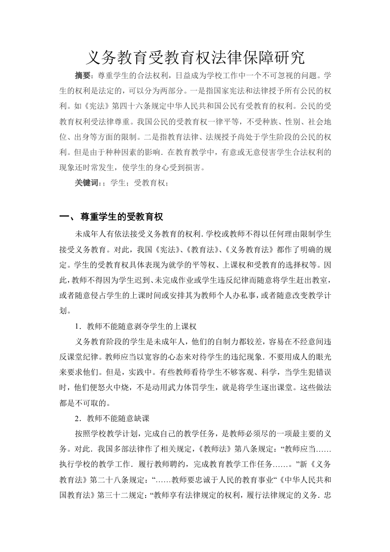 义务教育受教育权法律保障研究摘要:尊重学生的合法权利,日益成为学校工作中一个不可忽视的问题。学生的权利是法定的,可以分为两部分。一是指国家宪法和法律授予所有公民的权利。如《宪法》第四十六条规定中华人民共和国公民有受教育的权利。公民的受教育权利受法律尊重。我国公民的受教育权一律平等,不受种族、性别、社会地位、出身等方面的限制。二是指教育法律、法规授予尚处于学生阶段的公民的权利。但是由于种种因素的影响.在教育教学中,有意或无意侵害学生合法权利的现象还时常发生,使学生的身心受到损害。一、尊重学生的受教育权未成年人有依法接受义务教育的权利.学校或教师不得以任何理由限制学生接受义务教育。对此,我国《宪法》、《教育法》、《义务教育法》都作了明确的规定。学生的受教育权具体表现为就学的平等权、上课权和受教育的选择权等。因此,教师不得因为学生迟到、未完成作业或学生违反纪律而随意将学生赶出教室,或者随意侵占学生的上课时间或安排其为教师个人办私事,或者随意改变教学计划。1.教师不能随意剥夺学生的上课权义务教育阶段的学生是未成年人,他们的自制力都较差,容易在不经意间违反课堂纪律。教师应当以宽容的心态来对待学生的违纪现象.不要用成人的眼光来要求他们。但是,实践中。有些教师看待学生不够客观、科学,当学生犯错误时,他们便怒火中烧,不是动用武力体罚学生,就是将学生逐出课堂。这些做法都是不可取的。2.教师不能随意缺课按照学校教学计划,完成自己的教学任务,是教师必须尽的一项最主要的义务。对此.我国多部法律作了相关规定,《教师法》第八条规定:“教师应当…执行学校的教学工作.履行教师聘约,完成教育教学工作任务..。”新《义务教育法》第二十八条规定:“教师要忠诚于人民的教育事业“《中华人民共和国教育法》第三十二规定:“教师享有法律规定的权利,履行法律规定的义务.忠诚于人民的教育事业。”《未成年人尊重法》第十八条规定:“学校应当尊重未成年学生的受教育权.…。”《小学教师职务试行条例》对义务教育教师的任职条件作了以下规定:“有良好的师德.遵纪守法.品德言行堪为学生的表率,关心爱护学生,教书育人,使学生在德育、智育、体育等方面得到全面发展,努力做好本职工作。”尽管有如此多的法律规定,然而许多教师由于缺乏法律意识和学校监管机制较差,经常无故不上课。例如,三星区中学物理教师杨某对工作缺乏责任感,好喝酒、赌博,经常因喝酒、赌博等事情缺课,学生上自习自学或把课让给其他科任教师。学校领导对其进行多次教育而不改,最后家长将其反映到上级教育主管部门,杨某受到了行政处分。学生到学校是接受教育的,如果教师不给学生上课,实际上就已经侵犯了学生的受教育权。二、受教育权的相关内涵1、受教育权的内涵受教育权对于我国公民来说是一项宪法规定的基本权利。我国《宪法》第四十六条明确规定公民享有受教育权。全国人大常委会办公厅也对该项权利的含义和内容做出了解释说明:受教育权是这样一种权利,一种公民既可以从国家那里得到接受教育的机会,获得接受教育机会的物质上的支持的权利:又可以在自身教育权利受到损害的时候,要求国家及时提供相应的行政救济或司法救济,及时使权利恢复到被损害之前的状态的权利。关于受教育权的定义,我国主要有以下界定。资格能力说。劳凯声教授提出公民在不同阶段享有接受相关教育机会和内容的能力或具有接受相关教育机会和内容的资格。这种能力或资格是受法律保护的不能被任意损害的,即便遭受损害也应当给予适当的赔偿。权利说。秦惠民教授认为受教育权是作为权利主体的公民理应享有的一种权利。公民可以凭借这样一种权利要求国家提供为实现其教育目的的相关内容:它要求国家负责提供相关的学习材料以及其他有关教学的基础设施,同时也要求国家保障相应的学习机会。因此,不让公民到依法设立的教学机构就学,或者提出不平等的规定,使得公民的入学机会遭遇不公平的对待的情况即视为侵犯公民的受教育权。有学者认为受教育权由于不仅关乎个人的精神世界的养成,更涉及到个人内心世界的发展,所以,受教育权的概念非常的不确定,也没有清晰的内涵和外延考虑到每个意义上教育权的含义有所差别,其权利主体和保护方法也就有所区别。国外学者如英国理查德·克勒顿(Richad Clayton)认为,受教育权由多种权利混合而成的,目前情况下认可度还有待提高的复合权利?,认为受教育权跻身在各项不同的权利之间,公民可依据自身享有的受教育权,向国家提出为满足自身教育目的的相关要求,比如要求国家提供教育基础设施和提供学习内容。但也要考虑一点,即英国将受教育权当作是与自由权相关的一种权利。就本文而言,受教育权是公民作为权利主体要求作为义务主体的公立高校提供教学条件和内容,保障其实现自我全面发展的权利。在一国范围梦内,受教育权的权利主体是该国的全体公民,义务主体是国家、政府行政机关、学校等,受教育权的内容包括平等权、自由权以及申诉救济权。2、受教育权的平等内涵受教育平等权是指公民在法定范围内,以宪法和其他相关法律作为权利依据,平等的享受