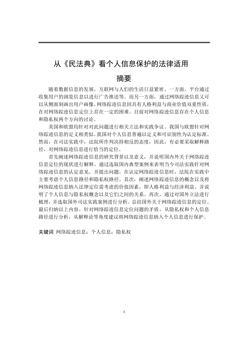 从《民法典》看个人信息保护的法律适用摘要随着数据信息的发展,互联网与人们的生活日益紧密,一方面,平台通过收集用户的浏览信息以进行广告推送等。而另一方面,通过网络踪迹信息又可以从侧面刻画出用户画像。网络踪迹信息因具有人格利益与商业价值双重性质,在对网络踪迹信息定位上存在一定的困难。目前对网络踪迹信息存在个人信息和隐私权两个方向的讨论。美国和欧盟均针对对此问题进行相关立法和实践争议。我国与欧盟针对网络踪迹信息的定义相类似。我国对个人信息普遍以定义和可识别性为认定标准。然而,在司法实践中,法院所作判决持相反的态度,因此,有必要采取解释路径,对网络踪迹信息进行恰当的定位。首先阐述网络踪迹信息的研究背景以及意义,并说明国内外关于网络踪迹信息定位的现状进行解释。通过选取国内典型案例来表明当今司法实践针对网络踪迹信息的认定意见,并提出问题。在认定网络踪迹信息时,法院在实践中主要考虑个人信息路径和隐私权路径。其次,阐述网络踪迹信息的概念以及将网络踪迹信息纳入法律定位需考虑的价值因素,即人格利益与经济利益。并说明了个人信息与隐私权概念以及它们之间的关系。再次,通过对国外立法进行梳理,并选取国外司法实践案例进行分析。总结国外关于网络踪迹信息的定位。最后归纳以上内容,针对网络踪迹信息定位问题的矛盾,从隐私权和个人信息路径进行分析,从解释论等角度建议将网络踪迹信息纳入个人信息进行保护。关键词网络踪迹信息:个人信息;隐私权Viewing the Application of Laws in the Protection ofPersonal Information from the Civil CodeAbstractWith the development of data information,the Internet has become increasinglyclose to people's lives.The platform collects users'browsing information to pushadvertisements and so on.On the other hand,user portraits can be portrayed from theside through network trace information.Because network trace information has thedual nature of personality benefits and commercial value,there are certaindifficulties in locating network trace information.At present,there are discussions onboth personal information and privacy rights for network trace information.Both the United States and the European Union have controversial legislation andpractice on this issue.my country and the European Union have similar definitionsfor network trace information.In my country,the definition and identifiability ofpersonal information are generally regarded as the standard.However,in judicialpractice,the court's judgments hold the opposite attitude.Therefore,it is necessary toadopt an interpretation path to properly locate the network trace information.First,explain the research background and significance of network traceinformation,and explain the current situation of network trace informationpositioning at home and abroad.By selecting typical domestic cases,it shows theopinions of current judicial practice on the identification of network traceinformation,and raises questions.When determining network trace information,thecourt mainly considers the path of personal information and the path of privacy inpractice.Secondly,it elaborates on the concept of network trace information and thevalue factors that need to be considered when incorporating network traceinformation into legal positioning,namely,personality interests and economicinterests.It also explains the concept of personal information and privacy and therelationship between them.Thirdly,through sorting out foreign legislation,andselecting foreign judicial practice cases for analysis.Summarize the positioning ofinformation on network traces abroad.Finally,the above content is summarized,inview of the contradiction in the location of network trace information,the analysis iscarried out from the perspective of privacy and personal information,and it isrecommended to include network trace information in personal information forprotection from the perspective of interpretation theory.Keywords Network trace information;personal information;privacy