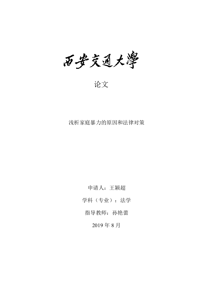 论文浅析家庭暴力的原因和法律对策申请人:王颖超学科(专业):法学指导教师:孙艳蕾2019年8月目录网络教育学院毕业设计(论文)任务书专业班级法学1703层次专升本姓名王颖超学号117031603051822一、毕业设计(论文)题目浅析家庭暴力的原因和法律对策二、毕业设计(论文)工作自2019年5月27日起至2019年9月26日止三、毕业设计(论文)基本要求:撰写毕业论文是对所学专业知识的学习内容总结,是对在学校学习期间的一次全面的考核,论文必须完成如下工作:(1)根据选题的内容深入调研,搜集有关资料,对其进行归类整理,在此基础上撰写开题报告。(2)根据搜集的资料和开题报告(论文提纲)撰写论文初稿。论文应具有一定的独创性,论点明确,论据充分,论证条理清晰,重点突出,论述文字流畅,表述清晰,能够结合实际进行分析。(3)按学校规定的统一格式撰写,总体结构包括引论、本论、结论三部分,达到本科毕业论文写作的规范要求。(4)毕业论文正文部分(从绪论到结论)字数要求10000字左右。(5)按学校规定的进度和要求及时完成论文写作工作。目录指导教师:孙艳蕾