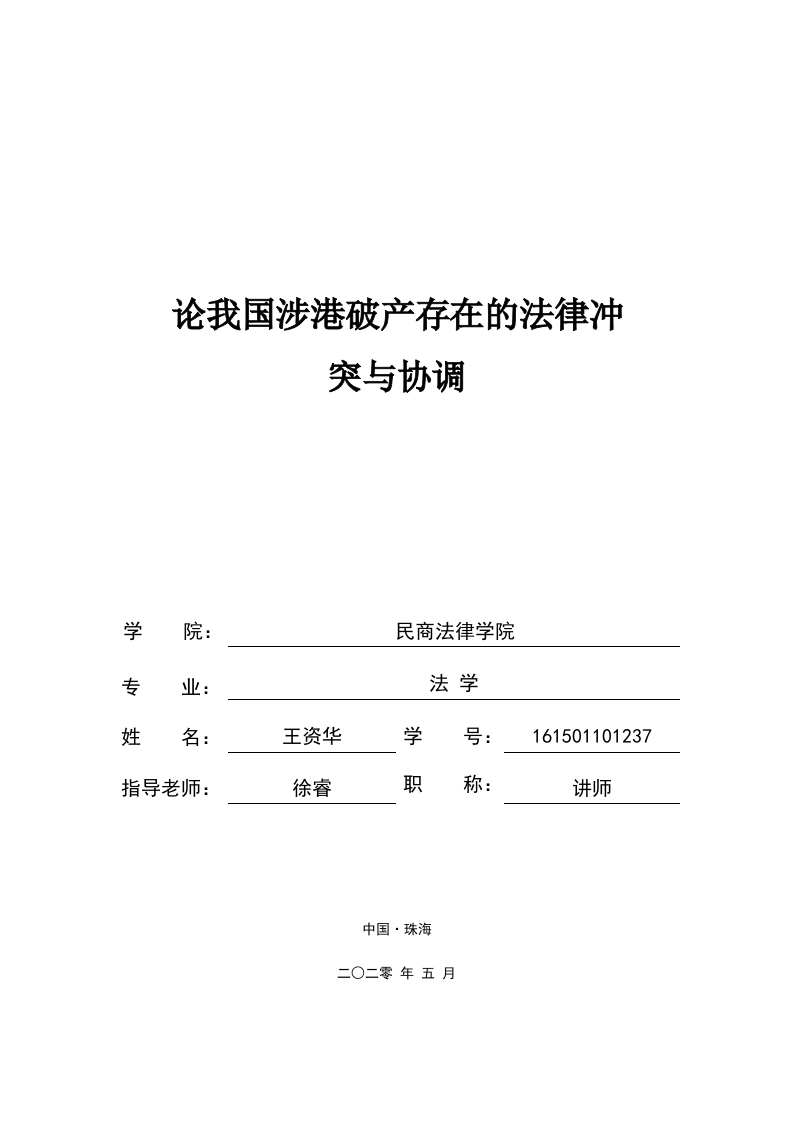 论我国涉港破产存在的法律冲突与协调学院:民商法律学院专业:法学姓名:王资华学号:161501101237指导老师:徐睿职称:讲师中国·珠海二O二零年五月北京理工大学珠海学院2020届本科生毕业论文诚信承诺书本人郑重承诺:我所呈交的毕业论文《论我国涉港破产存在的法律冲突与协调》是在指导教师的指导下,独立开展研究取得的成果,文中引用他人的观点和材料,均在文后按顺序列出其参考文献,论文使用的数据真实可靠。承诺人签名:日期:年月日1北京理工大学珠海学院2020届本科生毕业论文论我国涉港破产存在的法律冲突与协调摘要香港虽然于1997年回归了祖国的怀抱,但是由于实行“一国两制”的政策,香港继续使用与内地截然不同的法律体系。因此两地在司法实践上,不可避免地存在一些争议与冲突。涉港破产法律冲突就是在该背景下产生的一种冲突。自回归以来香港和内地经济交往的日益频繁,商贸联系的日益密切,而涉及内地与香港的跨境破产案件也随之增加。虽然内地和香港在经贸投资方面和司法合作方面作出了一系列措施,但是只能算是一种权宜之计,并没法解决涉港破产法律冲突这一问题。然而在“一带一路”的建设倡议下,香港对于内地企业的吸引力越来越大,这样也进一步促进涉港破产法律冲突这个问题越来越常态化。因此,本文旨在通过对内地和香港的破产法律制度研究,分析其中的矛盾,为两地经贸交流和法治营商环境贡献绵薄之力。关键词:跨境破产;涉港破产法律冲突:香港破产制度:中国破产制度2