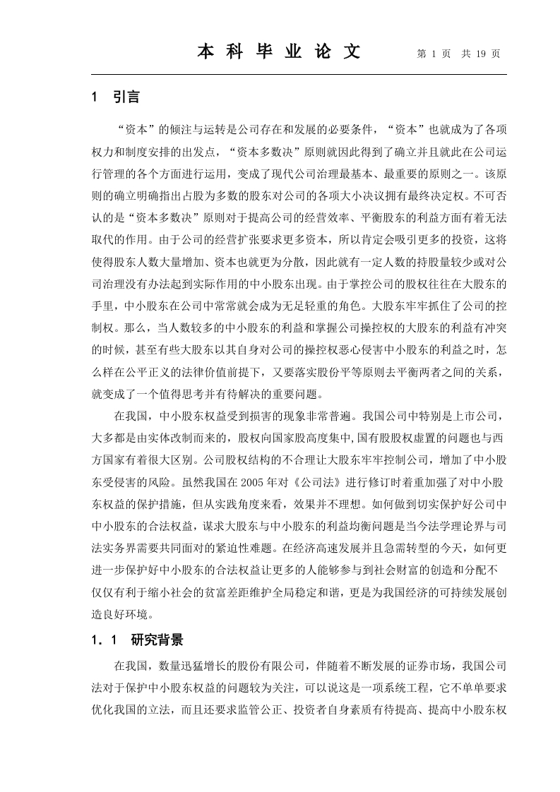 本科毕业论文第1页共19页1引言“资本”的倾注与运转是公司存在和发展的必要条件,“资本”也就成为了各项权力和制度安排的出发点,“资本多数决”原则就因此得到了确立并且就此在公司运行管理的各个方面进行运用,变成了现代公司治理最基本、最重要的原则之一。该原则的确立明确指出占股为多数的股东对公司的各项大小决议拥有最终决定权。不可否认的是“资本多数决”原则对于提高公司的经营效率、平衡股东的利益方面有着无法取代的作用。由于公司的经营扩张要求更多资本,所以肯定会吸引更多的投资,这将使得股东人数大量增加、资本也就更为分散,因此就有一定人数的持股量较少或对公司治理没有办法起到实际作用的中小股东出现。由于掌控公司的股权往往在大股东的手里,中小股东在公司中常常就会成为无足轻重的角色。大股东牢牢抓住了公司的控制权。那么,当人数较多的中小股东的利益和掌握公司操控权的大股东的利益有冲突的时候,甚至有些大股东以其自身对公司的操控权恶心侵害中小股东的利益之时,怎么样在公平正义的法律价值前提下,又要落实股份平等原则去平衡两者之间的关系,就变成了一个值得思考并有待解决的重要问题。在我国,中小股东权益受到损害的现象非常普遍。我国公司中特别是上市公司,大多都是由实体改制而来的,股权向国家股高度集中,国有股股权虚置的问题也与西方国家有着很大区别。公司股权结构的不合理让大股东牢牢控制公司,增加了中小股东受侵害的风险。虽然我国在2005年对《公司法》进行修订时着重加强了对中小股东权益的保护措施,但从实践角度来看,效果并不理想。如何做到切实保护好公司中中小股东的合法权益,谋求大股东与中小股东的利益均衡问题是当今法学理论界与司法实务界需要共同面对的紧迫性难题。在经济高速发展并且急需转型的今天,如何更进一步保护好中小股东的合法权益让更多的人能够参与到社会财富的创造和分配不仅仅有利于缩小社会的贫富差距维护全局稳定和谐,更是为我国经济的可持续发展创造良好环境1.1研究背景在我国,数量迅猛增长的股份有限公司,伴随着不断发展的证券市场,我国公司法对于保护中小股东权益的问题较为关注,可以说这是一项系统工程,它不单单要求优化我国的立法,而且还要求监管公正、投资者自身素质有待提高、提高中小股东权本科毕业论文第2页共19页益的意识、正确投资理念的确立等等。我国的公司制度成立初期,许多企业按照公司制度进行设立,非常多中小股东由股东关系不和谐的烦恼,中小股东权益受侵害的状况到处皆有,中小股东权益的保护可以说是没有保护措施,从中国对中小股东保护的现状来看,近些年来的证券市场的状况就是最好的反映。古往今来,大股东操控上市公司损害中小股东的现象不再少数。从“琼民源”等恶性经营事件,可以看出中小股东利益损失的恶性经营事件很常见。例如:“红光实业”、“大庆联谊”等,大股东恶意阻止中小股东担任公司高级管理职务,对整个市场造成了很大的冲击。公司内部交易、隐瞒利润、恶意增资都可以说是非常难以让人发现的行为,迫使中小股东因无力认购新股而进一步衡释其股权操纵公司股票价格,使中小股东被迫出售持股给大股东非法经营,违职损害公司利益时,以公司名义进行调查追究其违反公司章程,强行拒绝,为中小股东参加股东大会附加不合理条件等事件不再少数。持续发展的市场经济,达成全面建成小康社会,持续优化的社会法律制度,实力较弱的社会群体广泛受到关注,中小股东相对于大股东而言,实力较弱,我国应当建立起各项保护中小股东权益的措施和政策,防止大股东对其的伤害,平衡好大股东与实力较弱的股东之间的权利,尽可能的保护小股东的权益,推进法治社会的进程,在新《公司法》中,组成了一项分工合作的有机体系,实习较弱的股东在此有了较为健全的保护体系,其中有事前预防体系一一限制和排除表决权、异议股东股份收买请求权,又有事后保护体系一一独立董事制度和累计投票制度,还有补救体系一一给予中小股东诉权,这是一套升级的保护中小股东的体系,然而,在公司法使用功能方面还是存在问题,需要继续优化立法,更好的保护中小股东权益,在从今以后的立法中要快速做出调整。中小股东、大股东和管理者利益的协调是中国构建和谐社会的重要部分,对中国市场经济发展和社会主义建设有着深远的影响,因此这一课题将在以后逐步变成公司法及其有关制度不断优化的核心内容。1.2国内研究现状中国对中小股东权益保护的研究开始较晚,但随着市场经济的发展,中小股东权益保护受到关注,学者们为此付出了很多努力,一些学者关注保护中小股东权益的重要性。近现代公司法的历史是一部为了保护股东权而奋斗和努力的历史。实际上,公司法就是保护股东权利的法律。刘俊海主张,应该从四个方面来完善对中小股东权益[1]刘俊海.新《公司法》的设计理念与框架建议[山].法学杂志,2021,42(02):16.本科毕业论文第3页共19页的保护。赋予股东董事解任请求权、保护股东的知情权、股东要求解散的权利和股东要求重新整顿的权利。在民营企业上市已经成为趋势的背景下,民营企业上市公司中的中小股东权益保护不乐观,中小投资者利益得