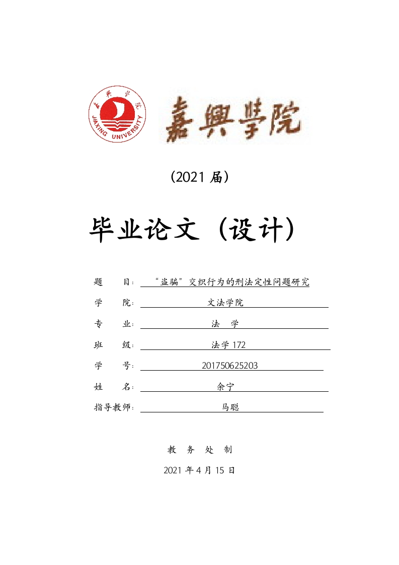 (2021届)毕业论文(设计)题目:“盗骗”交织行为的刑法定性问题研究文法学院专法学班级:法学172学201750625203姓名:余宁马聪教务处制2021年4月15日嘉兴学院本科生毕业论文(设计)诚信声明我声明,所呈交的论文(设计)是本人在老师指导下进行的研究工作及取得的研究成果。据我查证,除了文中特别加以标注和致谢的地方外,论文(设计)中不包含其他人已经发表或撰写过的研究成果,也不包含为获得或其他教育机构的学位或证书而使用过的材料。我承诺,论文(设计)中的所有内容均真实、可信。论文(设计)作者签名:签名日期:年月日嘉兴学院本科生毕业论文(设计)授权声明学校有权保留送交论文(设计)的原件,允许论文(设计)被查阅和借阅,学校可以公布论文(设计)的全部或部分内容,可以影印、缩印或其他复制手段保存论文(设计),学校必须严格按照授权对论文(设计)进行处理,不得超越授权对论文(设计)进行任意处置。论文(设计)作者签名:签名日期:年月日