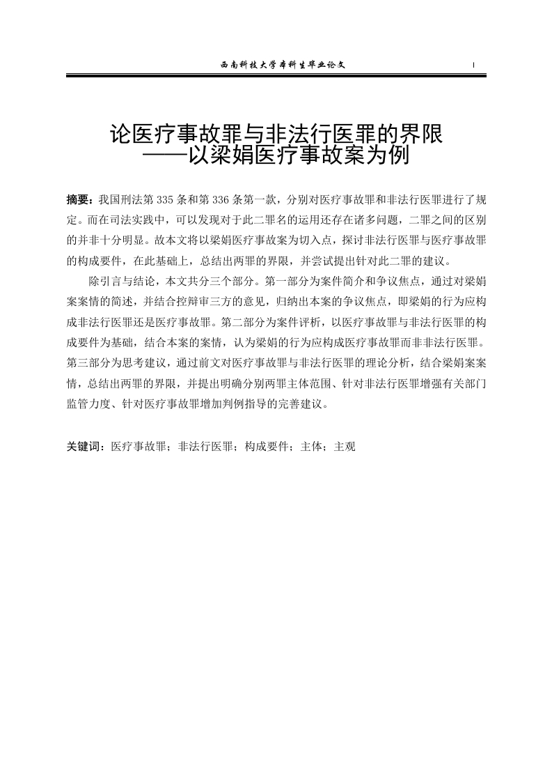 论医疗事故罪与非法行医罪的界限以梁娟医疗事故案为例-摘要:我国刑法第335条和第336条第一款,分别对医疗事故罪和非法行医罪进行了规定。而在司法实践中,可以发现对于此二罪名的运用还存在诸多问题,二罪之间的区别的并非十分明显。故本文将以梁娟医疗事故案为切入点,探讨非法行医罪与医疗事故罪的构成要件,在此基础上,总结出两罪的界限,并尝试提出针对此二罪的建议。除引言与结论,本文共分三个部分。第一部分为案件简介和争议焦点,通过对梁娟案案情的简述,并结合控辩审三方的意见,归纳出本案的争议焦点,即梁娟的行为应构成非法行医罪还是医疗事故罪。第二部分为案件评析,以医疗事故罪与非法行医罪的构成要件为基础,结合本案的案情,认为梁娟的行为应构成医疗事故罪而非非法行医罪。第三部分为思考建议,通过前文对医疗事故罪与非法行医罪的理论分析,结合梁娟案案情,总结出两罪的界限,并提出明确分别两罪主体范围、针对非法行医罪增强有关部门监管力度、针对医疗事故罪增加判例指导的完善建议。关键词:医疗事故罪:非法行医罪:构成要件:主体:主观ON THE BOUNDARY BETWEENTHE CRIME OF MEDICAL ACCIDENTANDTHE CRIME OF ILLEGAL MEDICALPRACTICEAbstract:The crime of medical accident and the crime of illegal practice of medicine are stipulated respectively in Article 335 and Paragraph 1 of Article 336 of Criminal Law of China.However,in judicial practice,we can find that there are still many problems in the application ofthe two crimes,and the difference between the two crimes is not very obvious.Therefore,this paper will take Liang Juan's medical malpractice case as the entry point to discuss the constituent elements of the crime of illegal medical practice and the crime of medical malpractice.On this basis,it summarizes the boundary of the two crimes,and tries to put forward suggestions for judicial perfection.In addition to the introduction and conclusion,this paper is divided into three parts.The first part is the brief introduction of the case and the focus of controversy.Through the brief introduction of the case of Liang Juan,and combining the opinions of the three parties,the dispute focus of the case is summarized,that is,should Liang Juan's behavior constitute the crime ofillegal medical practice or the crime of medical malpractice.The second part is the analysisof the case.Based on the constitution elements of the crime of medical malpractice and the crime of illegal medical practice,combining the facts of this case,it is concluded that Liang Juan's behavior should constitute the crime of medical malpractice rather than the crime of illegalmedical practice.The third part is thinking and suggestions.Based on the theoretical analysisof the crime of medical malpractice and the crime of illegal medical practice in the previous part,combined with the circumstances of Liang Juan's case,the boundary of the two crimes issummarized,and the improvement suggestions are put forward to clarify the main scope of the two crimes respectively,strengthen the supervision of relevant departments for the crime ofillegal medical practice,and increase the guidance of precedents for the crime of medical malpractice.Key words:crime of medical accident;illegal practice of medicine;constitutive requirement;subject;subjectivity