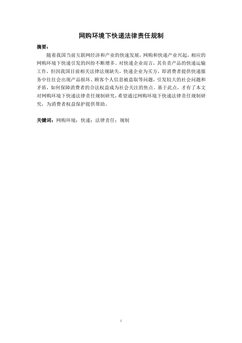 网购环境下快递法律责任规制摘要:随着我国当前互联网经济和产业的快速发展,网购和快递产业兴起,相应的网购环境下快递引发的纠纷不断增多。对快递企业而言,其负责产品的快递运输工作,但因我国目前相关法律法规缺失,快递企业为买方,即消费者提供快递服务中往往会出现产品损坏、顾客个人信息被盗取等问题,引发较大的社会问题和矛盾,如何保障消费者的合法权益成为社会关注的焦点。基于此点,才有了本文对网购环境下快递法律责任规制研究,希望通过网购环境下快递法律责任规制研究,为消费者权益保护提供帮助。关键词:网购环境:快递:法律责任:规制Legal Liability Regulation of Express under theEnvironment of Online ShoppingAbsrtact:With the rapid development of Internet economy and industry in China,onlineshopping and express industry are rising,and the disputes caused by express deliveryunder the corresponding online shopping environment are increasing.For expressdelivery enterprises,they are responsible for the express delivery of products.However,due to the lack of relevant laws and regulations in China,express deliveryenterprises provide express delivery services to buyers,that is,consumers,often haveproblems such as product damage,customer personal information stolen,which leadto larger social problems and contradictions.How to protect the legitimate rights andinterests of consumers has become the focus of social attention.Based on this point,this paper studies the regulation of express legal liability under the online shoppingenvironment,hoping to provide help for the protection of consumers'rights andinterests through the regulation of express legal liability under the online shoppingenvironment.Key words:Online shopping environment;Express delivery;Legal liability;Regulation目录摘要:Absrtact.............一、绪论…(一)研究背景(二)研究目的(三)研究意义(四)研究方法二、(二)网购环境下快递法律责任与消费者权益...3(三)网购环境下快递法律责任确定的影响...三、我国当前网购环境下快递法律责任存在的问题.5(一)在网购环境下快递法律责任立法缺失..5(二)网购环境下快递法律责任监管渠道有限(四)网购环境下快递法律责任中消费者自我保护法律理念有待完善..·6四、欧美国家网购环境下快递法律责任制度对我国的启发.·8(四)明确网购环境下快递法律责任的特殊性.…9五、完善我国网购环境下快递法律责任制度的对策...··1010(二)完善网购环境下快递法律责任监管渠道…10(四)提升网购环境下快递法律责任消费者自我保护认识.....11六、结论1213