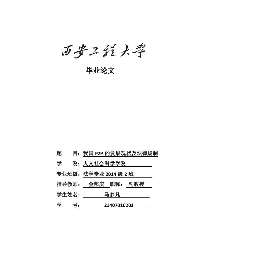 毕业论文题目:我国P2P的发展现状及法律规制学院:人文社会科学学院专业班级:法学专业2014级2班指导教师:金邦庆职称:副教授学生姓名:马梦凡学21407010203摘要P2P网贷毫无例外的与所有的新兴行业及企业经历着相同的生命周期。从萌芽到扩张,收缩,直到稳定的发展局面。不同的国家在P2P网贷的问题上也有着截然不同的监管方式和法律法规,在我们国家也应对本国的P2P监管模式以及法律法规进行探究。本论文共分五章。第一章是关于P2P的介绍以及与其贷款方式的比较:第三章是国外P2P的管理及相关规定:第二章与第四章为全论文的重点,则是对我国P2P的发展现状提出存在问题并结合法律法规对存在问题进行解释及维权;第五章是写P2P网贷的未来发展。随着P2P行业日趋成熟的发展,它将与“监管真空期”和“野蛮生长期”疏离,从而转型和净化,清楚P2P平台理想与现实的差距,最终实现罗伯特希勒心中“金融与美好社会”的互联网金融时代的大创新。关键词P2P,问题平台,风险因素,借贷网络平台ABSTRACTP2P network to borrow without exception of experiencing the same with all ofthe emerging industry and enterprise life cycle.From germination to expansioncontraction,until a stable development situation.Different countries on the issue ofP2P network credit also has a very different way of regulation and laws andregulations and also deal with the country's P2P regulatory model in our country andexplore the laws and regulations.This thesis is divided into five chapters.The firstchapter is about the introduction of P2P,and the comparison of its loan.The thirdchapter is a P2P abroad management and related regulations;The second chapter andthe fourth chapter is the focus of the whole thesis,it is about the present situation ofthe development of P2P in China put forward existing problems and combined withthe problems in the laws and regulations to explain and rights;The fifth chapter is towrite the future development of P2P network is borrowed.With the development of the P2P industry it will be alienated from the'regulatory vacuum period'and 'barbarous growth period',thus transforming andpurifying,and clarifying the gap between the ideal and reality of the P2P platform.Finally,it will realize the great innovation of the Internet financial era in the heart ofLuobotexile's 'Finance and a Beautiful Society'.KEY WORDS P2P,problem platform,risk factor,loan network platform