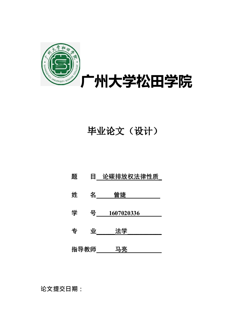 广州大学松田学院毕业论文(设计)题目论碳排放权法律性质姓名曾婕学号1607020336专业法学指导教师马亮论文提交日期:毕业论文原创性声明本人郑重声明:所呈交的毕业论文是本人在导师的指导下独立进行研究所取得的研究成果。除了文中特别加以标注引用的内容外,本毕业论文不包括任何其他个人或集体已经发表或撰写的成果作品。本人完全意识到本声明的法律后果由本人承担。作者签名:20年月日毕业论文版权使用授权书本毕业论文作者完全了解学校有关保障、使用毕业论文的规定,同意学校保留并向有关毕业论文管理部门或机构送交毕业论文的复印件和电子版,允许毕业论文被查阅和借阅。本人授权优秀毕业论文评选机构将本毕业论文的全部部分内容编入有关数据进行检索,可以采用影印、缩印或扫描等复制手段保存和汇编本毕业论文。本毕业论文属于1、保密口,在10年解密后适用本授权书2、不保密口。(请在以上相应方框内打“√”作者签名:20年月日导师签名:20年月日论碳排放权法律性质摘要:在实现人类经济社会可持续发展进程中,以二氧化碳为主的温室气体引发全球气候变化问题对发展造成了阻碍,这一现状推动世界各国与地区建立碳排放权交易制度。而关于法律性质尚不明确的碳排放权,不少学者对这一项新种类权利分别从法学、经济学和环境学等领域展开研究,其中碳排放权的发展权和排放权概念得到大部分支持。但在西方国家实施碳交易政策时,采用的是碳排放许可交易而排除了排污权的概念。多用于英美法系的财产权理论(property right)基于经济环境产权理论,认为碳排放权属于一种环境容量的使用权:行政权利说则定义碳排放权是一项在国家许可范围内使用国有环境容量资源的权利:物权说通过大陆法系的解释论和立法论研究碳排放权的公私权属性,将碳排放权界定到用益物权、准物权、准用益物权等几类学说中。明确的法律性质有助于碳交易机制的建立与完善,但当前关于碳排放权的法律属性学界还未达成理论共识,因此亟需在这方面加强研究以确立碳排放权法律性质,并建立相关法律法规、完善交易体系。本文通过查阅相关文献,将理论与实践相结合并采用规范分析、实证总结等方法,对碳排放权的内容、属性和特征等方面进行研究,为了解碳排放权的法律性质作出分析讨论。关键词:气候变化:温室气体排放:碳排放权:碳排放权交易:法律性质:On the Legal Nature of Carbon Emission RightAbstract:In the process of realizing the sustainable development of humaneconomy and society,greenhouse gases dominated by carbon dioxide have causedglobal climate change problems and hindered development.This status quoencourages countries and regions around the world to establish carbon emissiontrading systems.As for the carbon emission rights whose legal nature is not clear,many scholars have conducted research on this new type of rights from the fields of