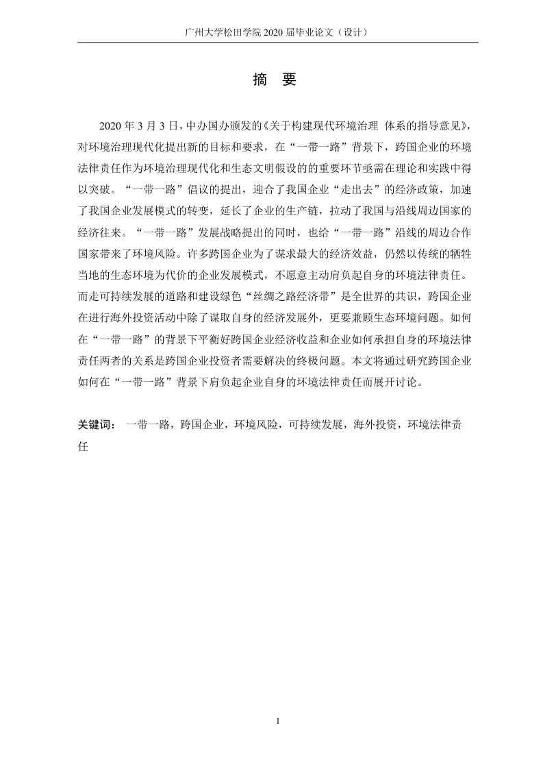 广州大学松田学院2020届毕业论文(设计)摘要2020年3月3日,中办国办颁发的《关于构建现代环境治理体系的指导意见》,对环境治理现代化提出新的目标和要求,在“一带一路”背景下,跨国企业的环境法律责任作为环境治理现代化和生态文明假设的的重要环节亟需在理论和实践中得以突破。“一带一路”倡议的提出,迎合了我国企业“走出去”的经济政策,加速了我国企业发展模式的转变,延长了企业的生产链,拉动了我国与沿线周边国家的经济往来。“一带一路”发展战略提出的同时,也给“一带一路”沿线的周边合作国家带来了环境风险。许多跨国企业为了谋求最大的经济效益,仍然以传统的牺牲当地的生态环境为代价的企业发展模式,不愿意主动肩负起自身的环境法律责任。而走可持续发展的道路和建设绿色“丝绸之路经济带”是全世界的共识,跨国企业在进行海外投资活动中除了谋取自身的经济发展外,更要兼顾生态环境问题。如何在“一带一路”的背景下平衡好跨国企业经济收益和企业如何承担自身的环境法律责任两者的关系是跨国企业投资者需要解决的终极问题。本文将通过研究跨国企业如何在“一带一路”背景下肩负起企业自身的环境法律责任而展开讨论。关键词:一带一路,跨国企业,环境风险,可持续发展,海外投资,环境法律责任广州大学松田学院2020届毕业论文(设计)Environmental Legal Responsibility Of The MultinationalEnterprises Under The "Belt and Road"StrategyAbstract:On March 3,2020,China Central Office issued the "guidance on theConstruction of Modern Environmental Governance system",which puts forward newgoals and requirements for the modernization of environmental governance.Under thebackground of "Belt and Road",the environmental legal responsibility of multinationalenterprises as an important link of environmental governance modernization andecological civilization hypothesis needs to be broken through in theory and practice.Theproposal of"Belt and Road"caters to the economic policy of "going out"of Chineseenterprises,accelerates the transformation of the development mode of Chineseenterprises,prolongs the production chain of enterprises,and stimulates the economicexchanges between China and the neighboring countries along the route.TheDevelopment Strategy of "Belt and Road"At the same time,it also brings environmentalrisks to the neighboring cooperative countries along the "Belt and Road".In order to seekthe greatest economic benefit,many multinational enterprises still take the traditionalenterprise development model at the expense of the local ecological environment,and areunwilling to take the initiative to shoulder their own environmental legal responsibility.And taking the road of sustainable development and building green "Silk Road EconomicBelt"is the consensus of the whole world,and multinational enterprises should take intoaccount the ecological environment problems in carrying out overseas investmentactivities in addition to seeking their own economic development.How to balance theeconomic benefits of multinational enterprises under the background of"Belt and Road"and how to bear their own environmental legal liability The relationship between thetwo is the ultimate problem that multinational enterprise investors need to solve.Thispaper will discuss how multinational enterprises should shoulder their own environmentallegal responsibility under the background of"Belt and Road".广州大学松田学院2020届毕业论文(设计)Key Words:"Belt and Road"Strategy,Transnational Enterprises,EnvironmentalRisks,Sustainable Development,Overseas Investment,Environmental Legal Liabilit