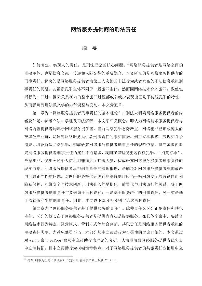 网络服务提供商的刑法责任摘要如何确定、实现人的责任,是刑法理论的核心问题。网络服务提供者是网络空间的重要主体,也是信息交流、传递和人际交往的重要媒介。本文研究的是网络服务提供者的刑事责任,解决的是网络服务提供者为第三人实施的非法行为或者发布的不法信息承担刑事责任的问题。其虽系犯罪主体不同于一般犯罪主体,然而因网络技术介入犯罪,致使包括行为、罪过、因果关系在内的整个犯罪过程都或多或少表现出区别于传统犯罪的特性,从而影响到刑法教义学的内部调整与变动。本文分五章。第一章为“网络服务提供者刑事责任的基本理论”。刑法未明确网络服务提供者的内涵及外延,参考立法、学理及司法解释,本文采广义概念,即认为网络技术服务提供者与网络内容提供者均属于网络服务提供者。当前网络犯罪态势严重,网络犯罪已形成庞大的灰黑色产业链,是研究网络服务提供者刑事责任的事实依据。刑事立法积极回应现实斗争需要,增设新型网络犯罪,构成研究网络服务提供者刑事责任的规范依据。世界范围内追究网络服务提供者刑事责任的案件不断增多,我国在审理侵犯著作权犯罪、“扫黄打非”、数据犯罪、侵犯公民个人信息犯罪加大了打击力度,构成研究网络服务提供者刑事责任的现实依据。网络服务提供者承担刑事责任的法理根据,是解决对网络服务提供者施加最严厉刑罚正当性的问题。对网络服务提供者进行刑法规制时应当平衡网络安全与言论自由和隐私保护、网络安全与技术创新、刑法介入的早期化、前置化与刑法谦抑的关系。鉴于网络服务提供者刑事责任主要来源于两种途径:一是基于服务产生的刑事责任,另一类是基于监管所产生的刑事责任。因此,本文以下部分将分别讨论这两种责任。第二章为“网络服务提供者基于提供服务的责任”。此种责任又区分正犯责任和共犯责任。区分的核心在于网络服务提供者是提供内容还是提供服务。在具体个案中,要结合网络技术行为特点、经营模式、营利方式等综合判断。共犯责任是网络服务提供者承担的主要责任类型。为避免处罚不当,本部分从中立帮助行为可罚性的讨论开始的。本文通过对winny案与ezPeer案及中立帮助行为理论的分析,认为现阶段网络服务提供者已失去中立性特征,且中立帮助行为模糊性等特点,对于网络服务提供者的共犯责任应慎用中立①冯军.刑事责任论(修订版).北京:社会科学文献出版社,2017.31.帮助行为理论。对于帮助信息网络犯罪活动罪,学界讨论的焦点仍是从大陆法系犯罪参与体系出发研究本罪的性质,然而本罪明显借鉴了美国刑法“犯罪促进罪”的立法技术,面对开放的网络技术,刑法理论也应当保持包容之心态。第三章为“网络服务提供者基于监管的不作为责任”。网络服务提供者基于监管产生的不作为责任,首要的问题就是解决作为义务的来源,形式的作为义务无法说明处罚的实质根据,基于危险源开启的安全保障义务可以成为研究网络服务提供者保证人地位的理论基石。我国刑法专门针对网络服务提供者设立的拒不履行信息网络安全管理义务罪,因介入行政前置性程序,刑行衔接不畅,是导致本罪适用率低的根本原因。我国代理式监管模式决定了网络服务提供者应当承担一般的审查义务,这一点与国外立法及实践存在根本区别。第四章为“网络服务提供者刑事责任的限制”。不同于我国的立法例,包括美国和欧盟在内的大部分国家采用的都是责任限制的立法例,称之为“避风港规则”。在深入研究避风港规则产生背景、规则内涵的基础上,本文认为,我国侵权法虽然引入了避风港规则,但在移植时已有变异。从性质上看,避风港规则是免责条件,但实践中也发挥着归责的作用。基于法秩序统一性,避风港规则有引入刑法领域的必要性和可行性。可以考虑将作为避风港规则核心内容的“通知-删除规则”及“红旗规则”引入构成要件符合性的判断。关键词:网络服务提供者正犯责任共犯责任不作为责任避风港规则2