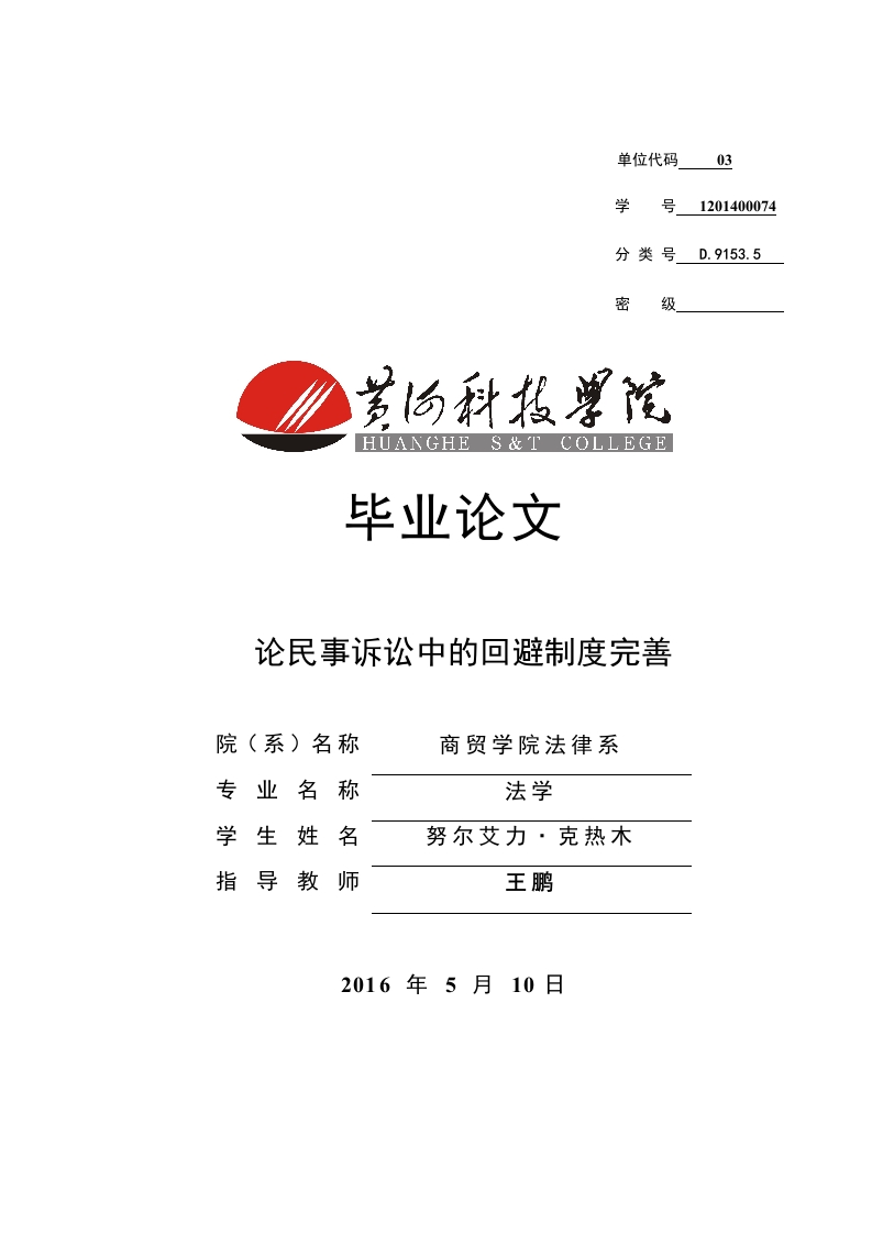 单位代码03学号1201400074分类号D.9153.5密级毕业论文论民事诉讼中的回避制度完善院(系)名称商贸学院法律系专业名称法学学生姓名努尔艾力·克热木指导教师王鹏2016年5月10日黄河科技学院毕业论文I论民事诉讼中的回避制度完善摘要在民事诉讼中,回避制度占有比较重要的地位,在我国古代就出现了回避制度的雏形,在以后的发展进程中,各个国家都比较重视回避制度的完普,无论是理论以及实践都引起了相关人员的重视。在民事诉讼中,要向做到公正公平,设立回避制度就显得尤为重要了,从而力争达到实体的公正。在我国建立新政权以来,民事诉讼回避制度的发展一直停滞不前,相比以前没有太大的变化,1991年颁布的《民事诉讼法》、2000年1月31日《最高人民法院关于审判人员严格执行回避制度的若干规定》以及2009年12月31日制定了《人民法院工作人员处分条例》,这使得我国民事诉讼回避在一定程度上得到的完善,但是仍存在着许多重大瑕疵。在综观我国现行的民事诉讼回避制度的大致框架后,笔者的结论是:回避制度的设立和我国宪法里其他的法律条文基本性质一直,都是比较注重在方便法院审判程序,在立法层次中就回避制度显得就比较粗糙,这些表现正式我国转型期中法律走向完善的一个有力表现,在我国回避制度发展的进程中存在着一些问题,作者通过对这些问题进行论述,找出改善回避制度的有效策略,在发展回避制度中,转变整个民事诉讼回避制度的思路是最重要的。关键词:回避制度,立法,程序黄河科技学院毕业论文On the perfection of withdrawal system in civilprocedureAuthor:Nu er ai liTutor:Wang PengAbstractto reform the system of avoiding many imperfections,the author believes that thetrans formation of the whole system of civil action is the most fundamental way ofthinking.this regard are highly valued.The main purpose of the establishment of thesystem of withdrawal of civil procedure is to ensure the justice.Court on judicialpersonnel strictly enforce the avoidance system of a number of provisionsof the entity.Improvement of China's civil litigation avoidance system after the founding ofnew China,have been slow to develop,January 31,1991,promulgated the "civil law",2000 the Supreme People's Court on judicial personnel strictly enforce the avoidancesystem of a number of provisions,"and of December 31,2009 set the regulation onthe punishment of the personnel of a people's court,which makes our civil litigationavoidance in a certain extent,but there are still many major flaws.After making acomprehensive survey of the general framework of the current system of withdrawalof civil procedure in our country,the author concludes that:Avoidance system and ourcountry currently many other litigation system as,design philosophy of too muchemphasis on in the courts and management convenience,legislation technology iscareless and simple,this also is precisely the embodiment of symptoms and pathologyin the transition period of our country the civil litigation system and the judicialsystem.Therefore,to reform the system of avoiding many imperfections,the authorbelieves that the transformation of the whole system of civil action is the mostfundamental way of thinking.